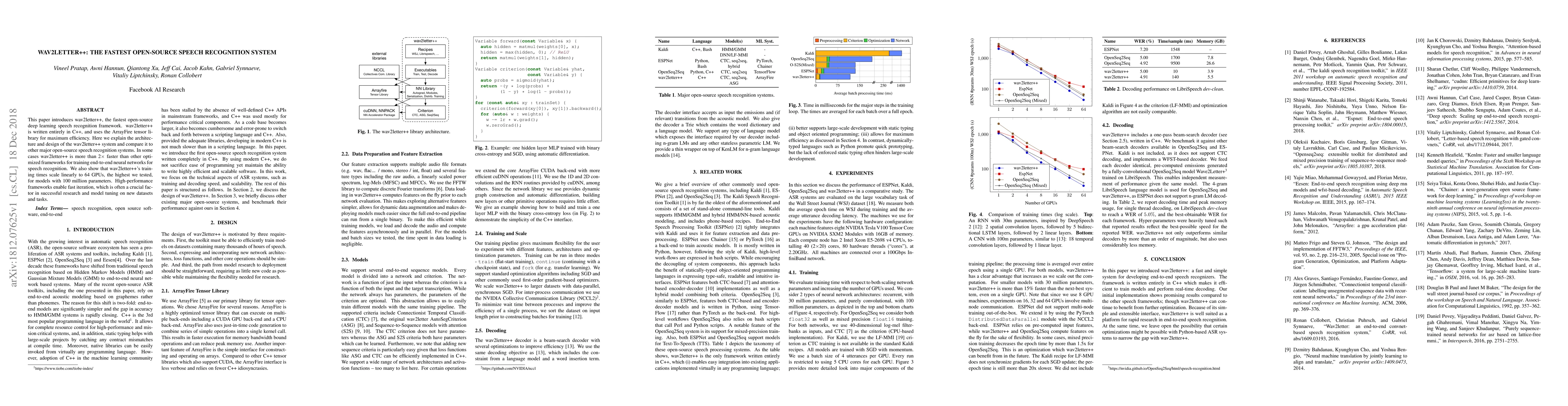 The paper introduces wav2letter++, a deep learning speech recognition framework written in C++ using the ArrayFire tensor library for maximum efficiency. It compares wav2letter++ to other major open-source speech recognition systems, demonstrating its speed and scalability.