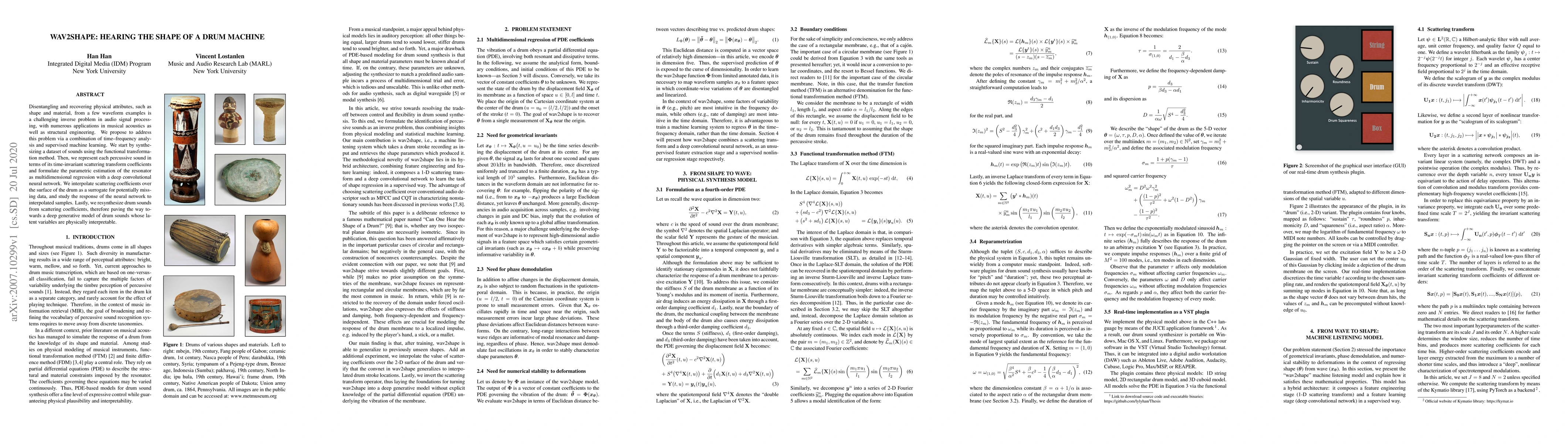 This paper proposes a method to recover physical attributes like shape and material from drum machine sounds using time-frequency analysis and supervised machine learning. It employs scattering transform coefficients and a deep convolutional neural network for multidimensional regression to estimate drum resonators.