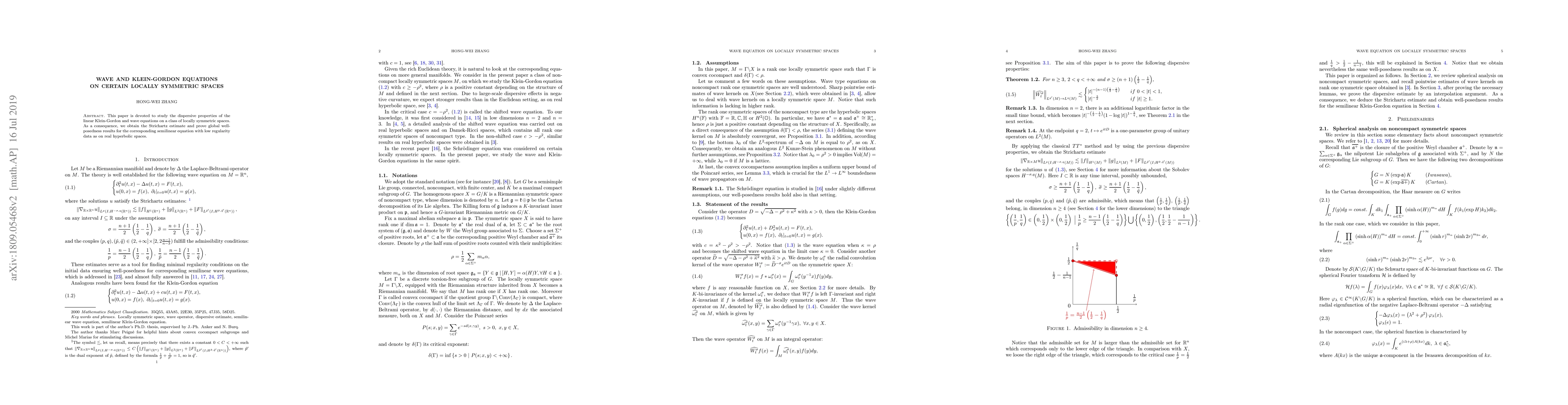 This paper investigates the dispersive properties of the Klein-Gordon and wave equations on locally symmetric spaces, deriving Strichartz estimates and establishing global well-posedness for semilinear equations with low regularity data on real hyperbolic spaces.