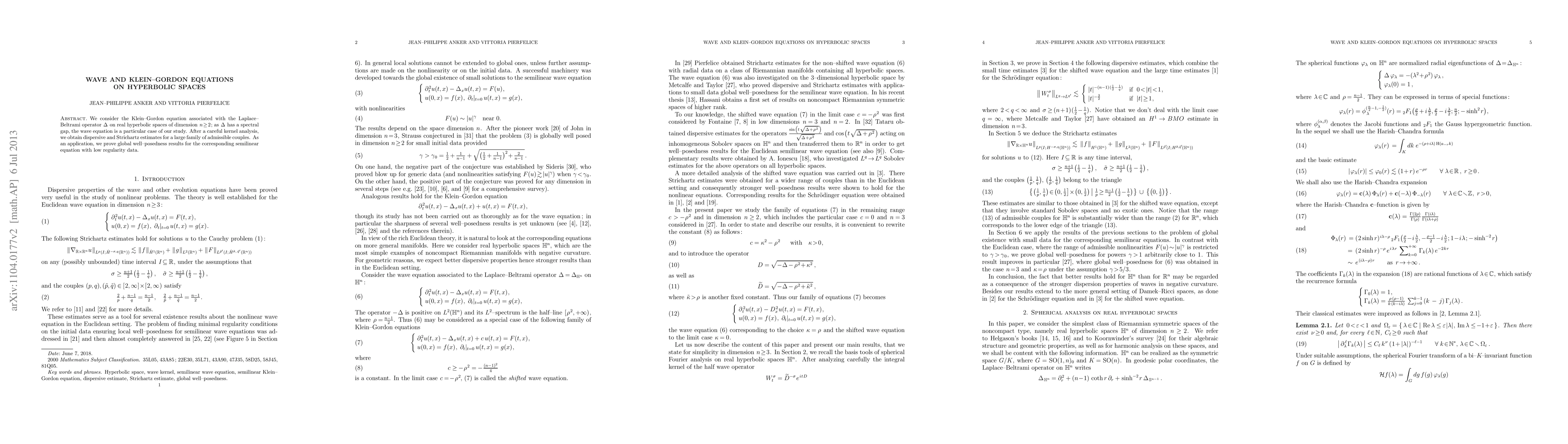 This paper studies the Klein-Gordon equation on real hyperbolic spaces, deriving dispersive and Strichartz estimates for the wave equation. It also proves global well-posedness for semilinear equations with low regularity initial data.