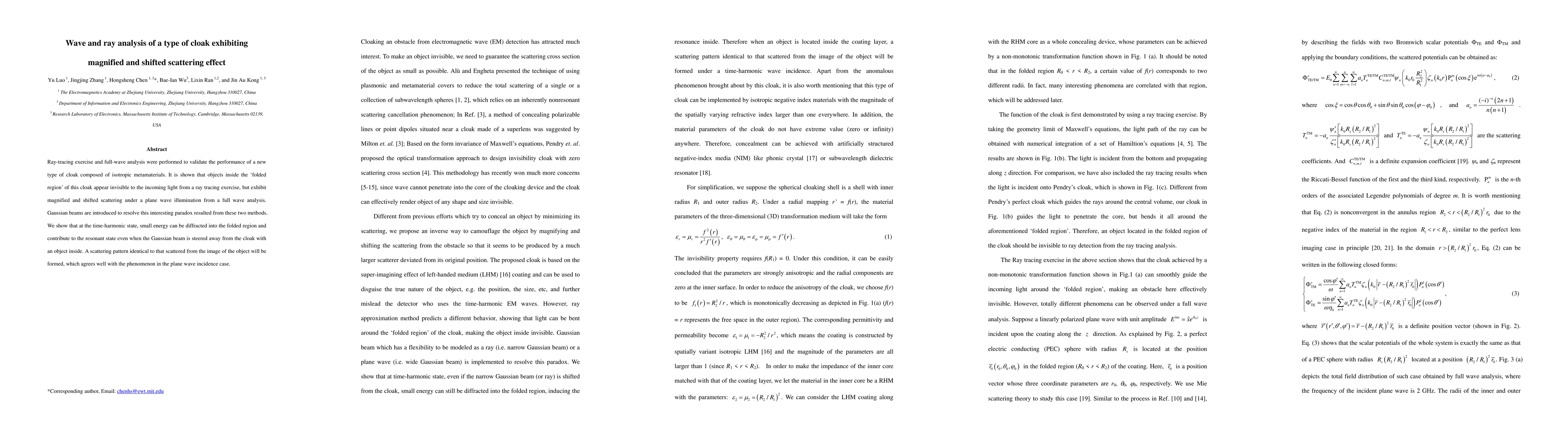 Ray-tracing exercise and full-wave analysis were performed to validate the performance of a new type of cloak composed of isotropic metamaterials. It is shown that objects inside the folded region of this cloak appear invisible to the incoming light from a ray tracing exercise, but exhibit magnified and shifted scattering under a plane wave illumination from a full wave analysis. Gaussian beams are introduced to resolve this interesting paradox resulted from these two methods. We show that at the time-harmonic state, small energy can be diffracted into the folded region and contribute to the resonant state even when the Gaussian beam is steered away from the cloak with an object inside. A scattering pattern identical to that scattered from the image of the object will be formed, which agrees well with the phenomenon in the plane wave incidence case.