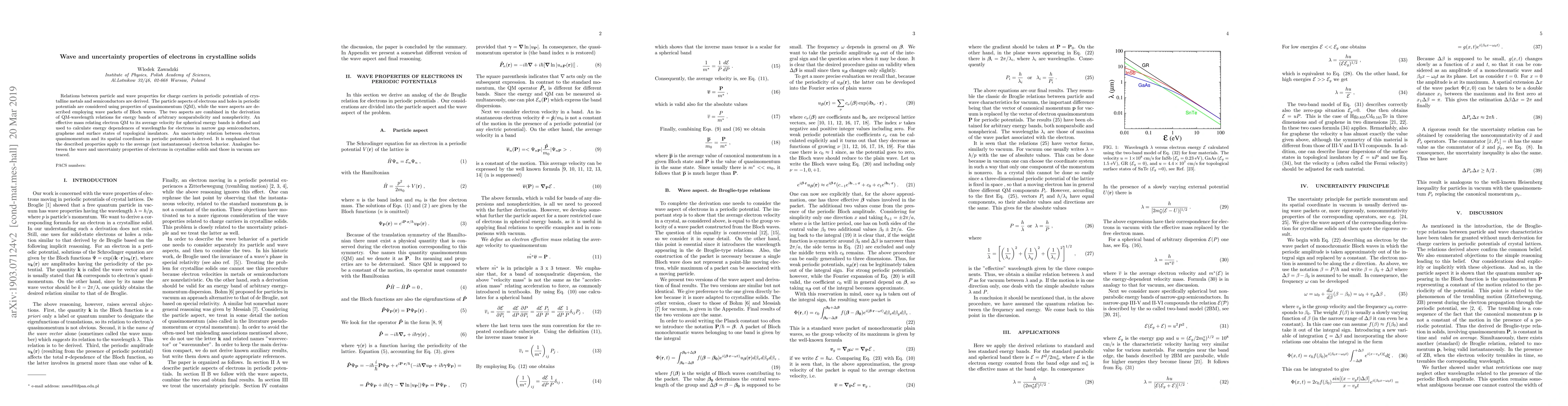 This paper explores the interplay between particle and wave properties of electrons in crystalline solids, using quasimomentum and Bloch wave packets. It derives quasimomentum-wavelength relations for nonparabolic energy bands and discusses effective mass in spherical bands, applying these to narrow gap semiconductors, graphene, and topological insulators. An uncertainty relation for electron quasimomentum and spatial coordinate is also established, highlighting analogies between electrons in solids and vacuum.