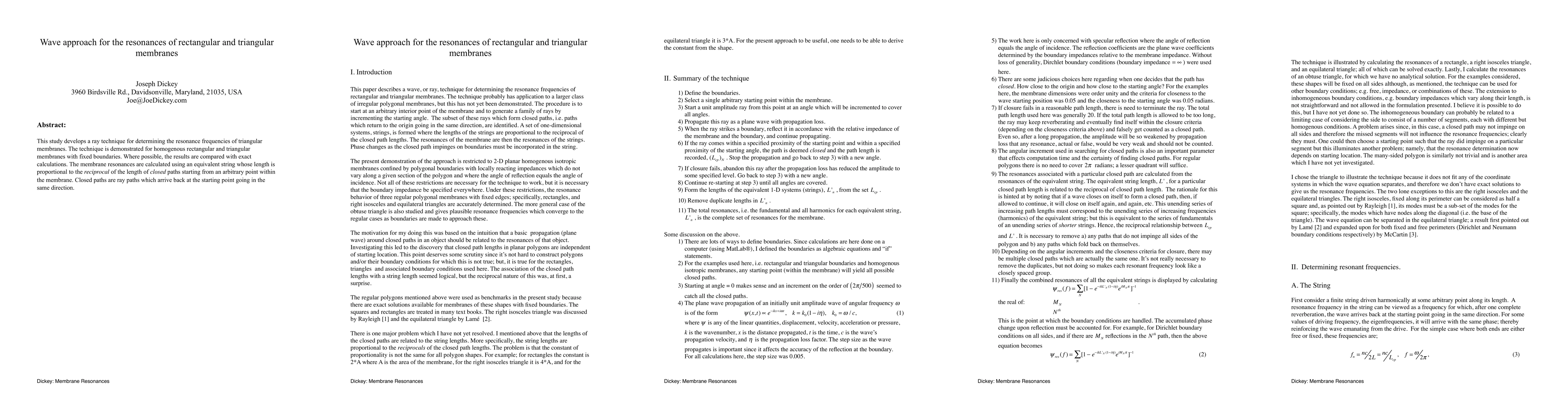 This research introduces a ray method to compute resonance frequencies of rectangular and triangular membranes, comparing results with exact calculations. The technique uses an equivalent string length proportional to the reciprocal of closed path lengths within the membrane.