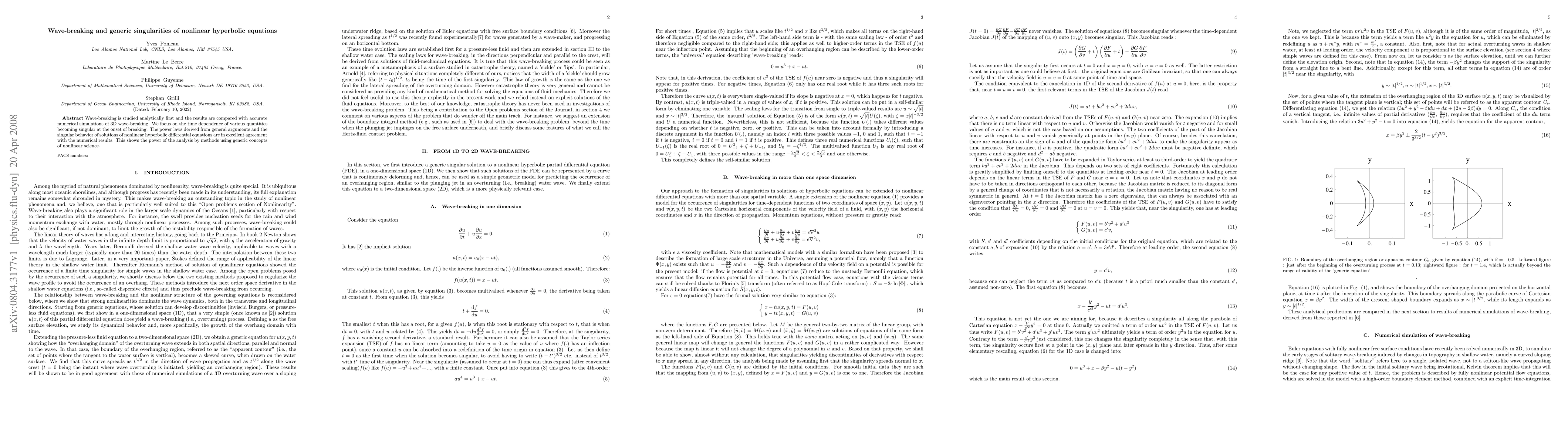 This research analyzes wave-breaking in nonlinear hyperbolic equations, deriving power laws for singular quantities at breaking onset. These results align with 3D numerical simulations, validating the use of generic concepts from nonlinear science in such analyses.