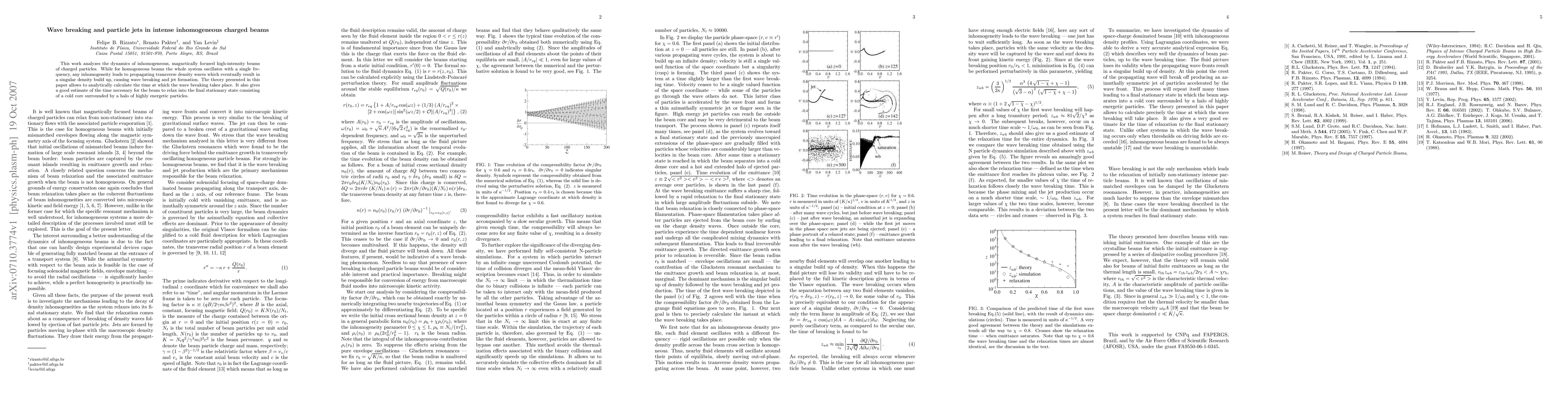 This work analyzes the dynamics of inhomogeneous, magnetically focused high-intensity beams of charged particles. While for homogeneous beams the whole system oscillates with a single frequency, any inhomogeneity leads to propagating transverse density waves which eventually result in a singular density build up, causing wave breaking and jet formation. The theory presented in this paper allows to analytically calculate the time at which the wave breaking takes place. It also gives a good estimate of the time necessary for the beam to relax into the final stationary state consisting of a cold core surrounded by a halo of highly energetic particles.