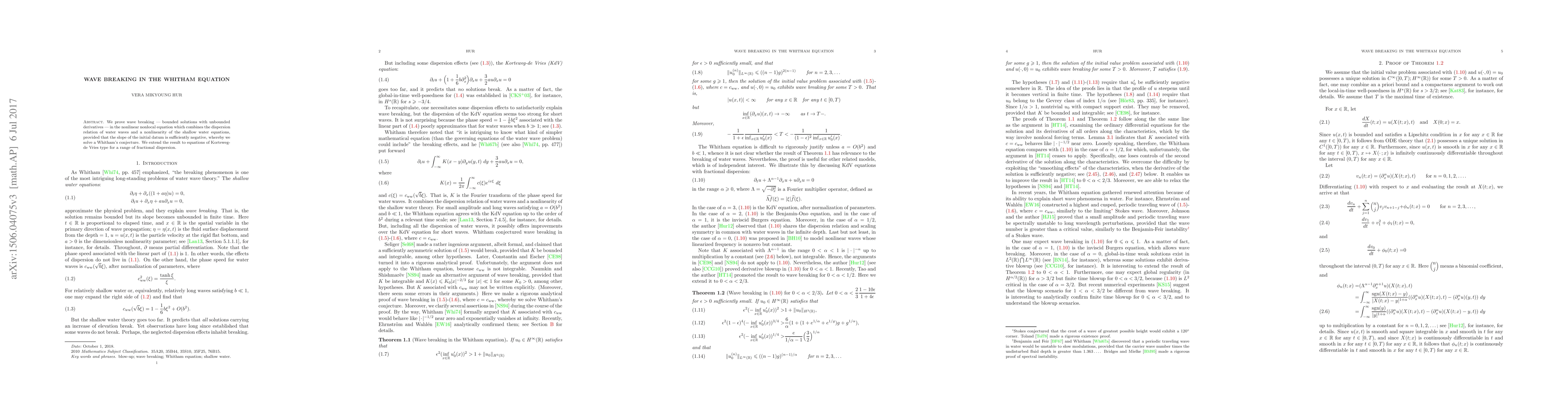 This paper proves wave breaking in the Whitham equation, demonstrating that solutions can remain bounded while their derivatives become unbounded under sufficiently negative initial slopes, thus resolving a conjecture by Whitham. The findings are also extended to Korteweg-de Vries type equations with fractional dispersion.