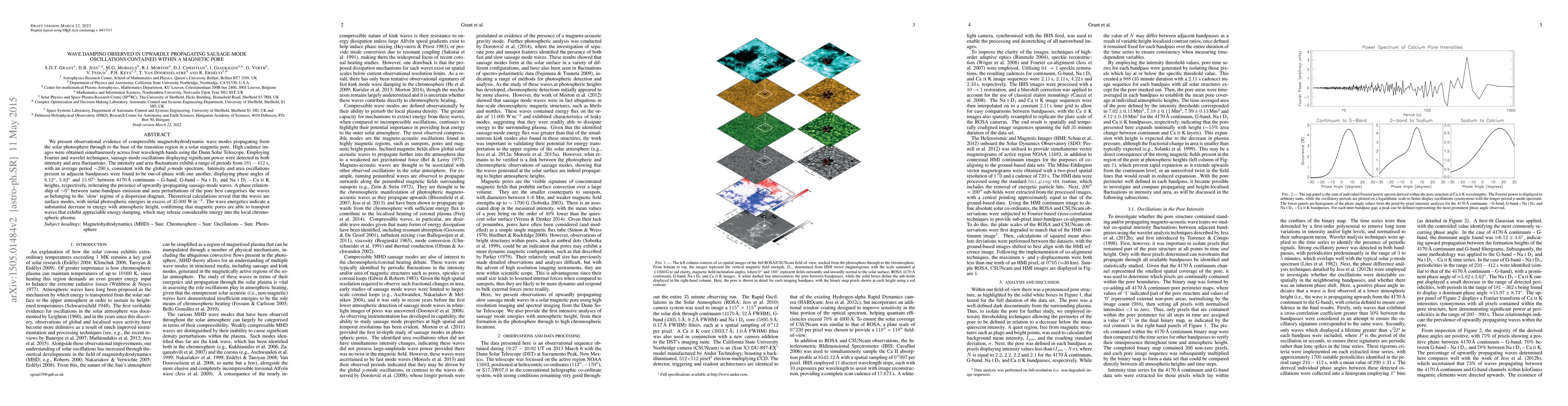Researchers observed sausage-mode oscillations propagating from the solar photosphere to the base of a magnetic pore, indicating wave damping with significant energy loss at higher atmospheric heights.