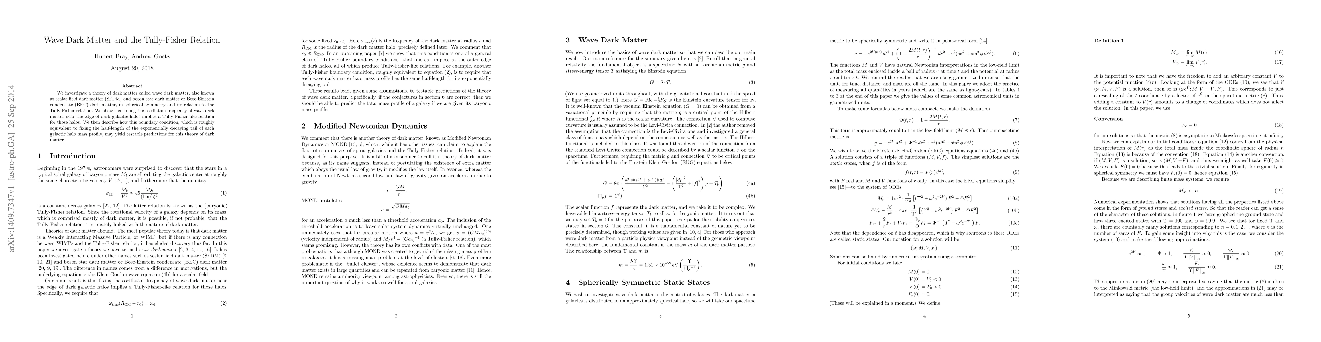 This paper explores wave dark matter, specifically scalar field dark matter (SFDM), and its potential to explain the Tully-Fisher relation. It demonstrates that adjusting the oscillation frequency of wave dark matter at the edge of galactic halos can produce a Tully-Fisher-like relation, offering testable predictions for this dark matter theory.