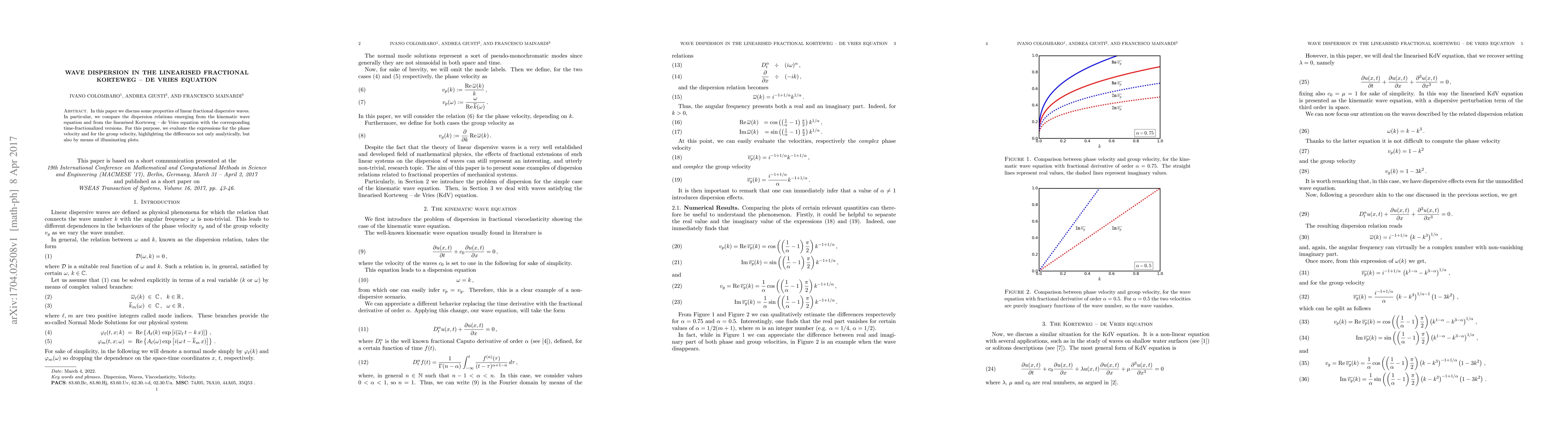 In this paper we discuss some properties of linear fractional dispersive waves. In particular, we compare the dispersion relations emerging from the kinematic wave equation and from the linearised Korteweg - de Vries equation with the corresponding time-fractionalized versions. For this purpose, we evaluate the expressions for the phase velocity and for the group velocity, highlighting the differences not only analytically, but also by means of illuminating plots.