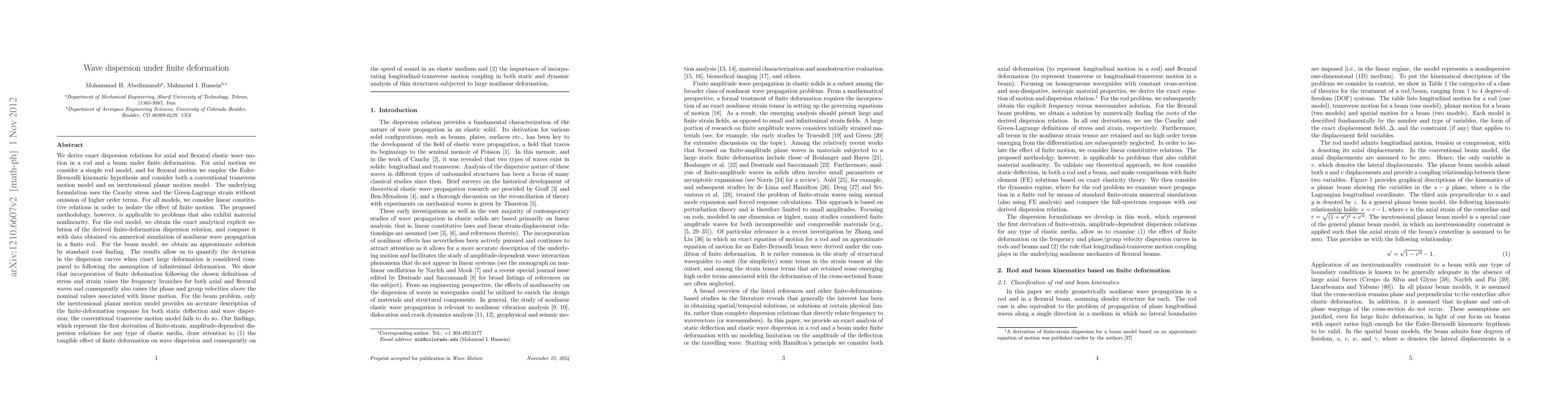 This paper derives exact dispersion relations for elastic waves in rods and beams under finite deformation, showing that finite deformation significantly alters wave dispersion compared to infinitesimal deformation assumptions. The study highlights the importance of considering material nonlinearity and coupling effects in the analysis of thin structures.