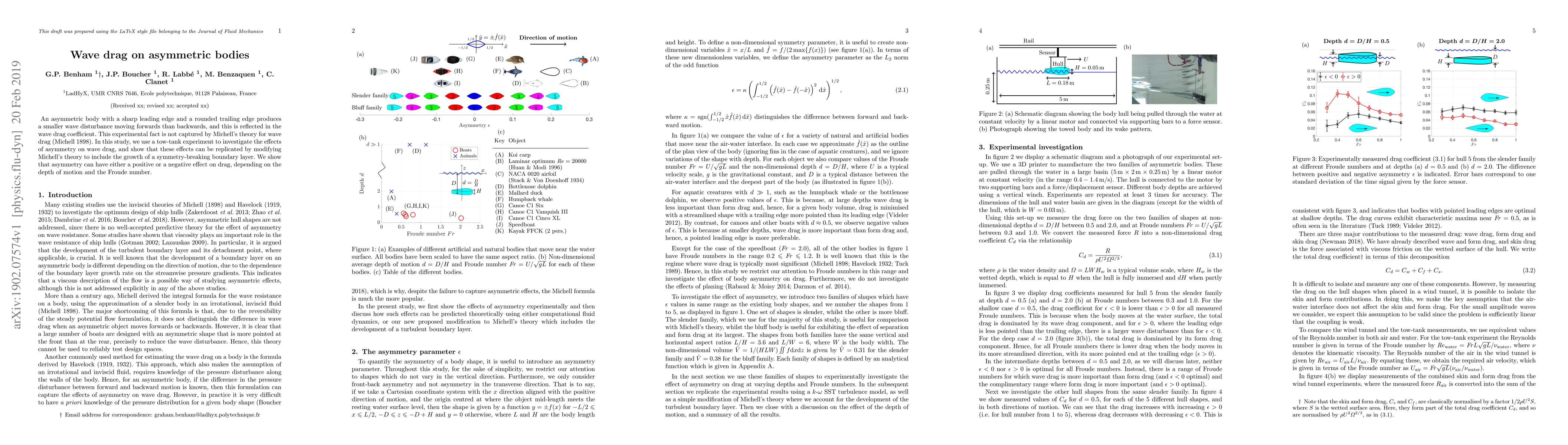 Researchers studied wave drag on asymmetric bodies and found that modifying Michell's theory to include a symmetry-breaking boundary layer can accurately predict the effects of asymmetry on wave drag. The study showed that asymmetry can either increase or decrease drag depending on the depth of motion and Froude number.