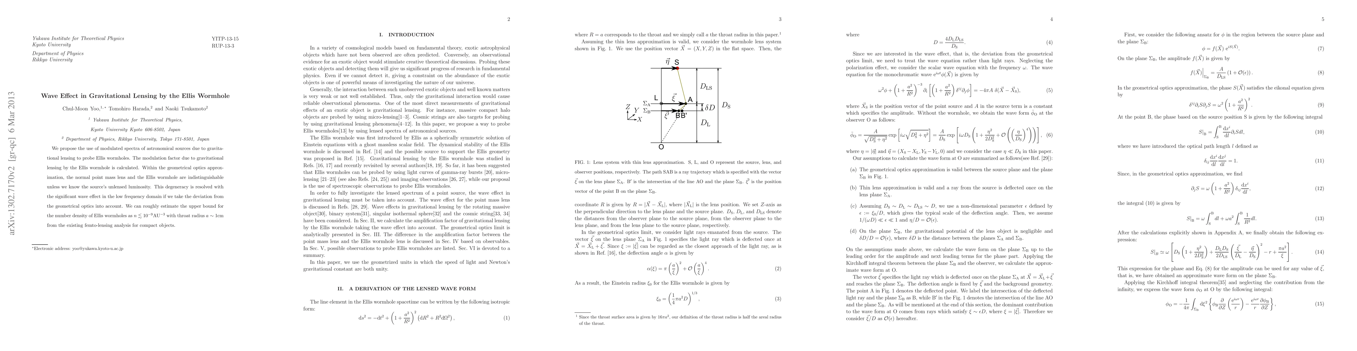 The paper derives the amplification factor for gravitational lensing by Ellis wormholes, including wave effects in the low-frequency domain, and compares it with the geometrical optics limit, resolving the degeneracy between Ellis wormholes and point mass lenses.