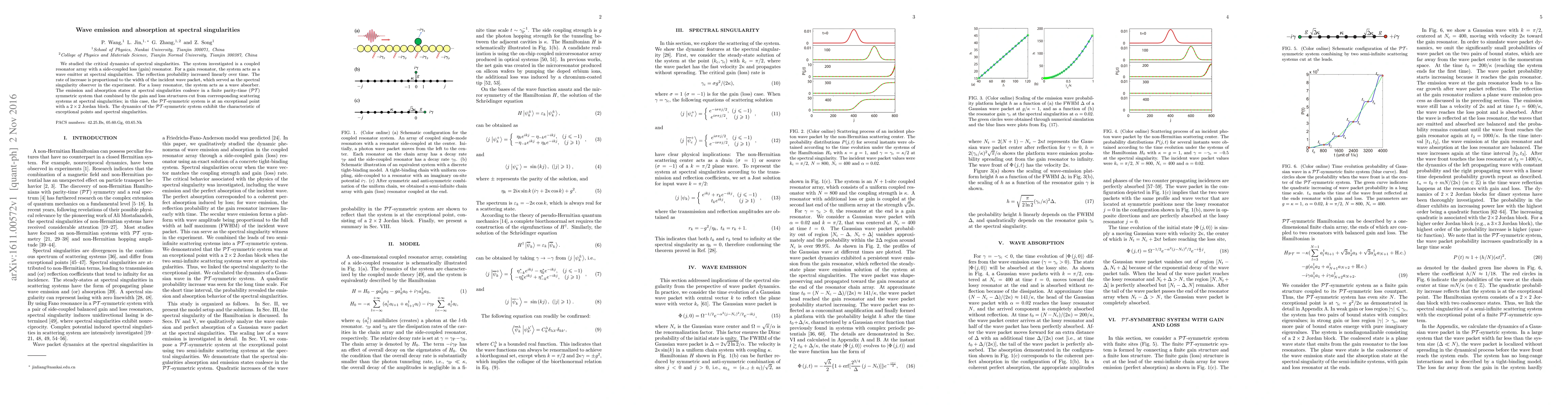 We studied the critical dynamics of spectral singularities. The system investigated is a coupled resonator array with a side-coupled loss (gain) resonator. For a gain resonator, the system acts as a wave emitter at spectral singularities. The reflection probability increased linearly over time. The rate of increase is proportional to the width of the incident wave packet, which served as the spectral singularity observer in the experiment. For a lossy resonator, the system acts as a wave absorber. The emission and absorption states at spectral singularities coalesce in a finite parity-time (PT ) symmetric system that combined by the gain and loss structures cut from corrresponding scattering systems at spectral singularities; in this case, the PT -symmetric system is at an exceptional point with a 2 * 2 Jordan block. The dynamics of the PT -symmetric system exhibit the characteristic of exceptional points and spectral singularities.