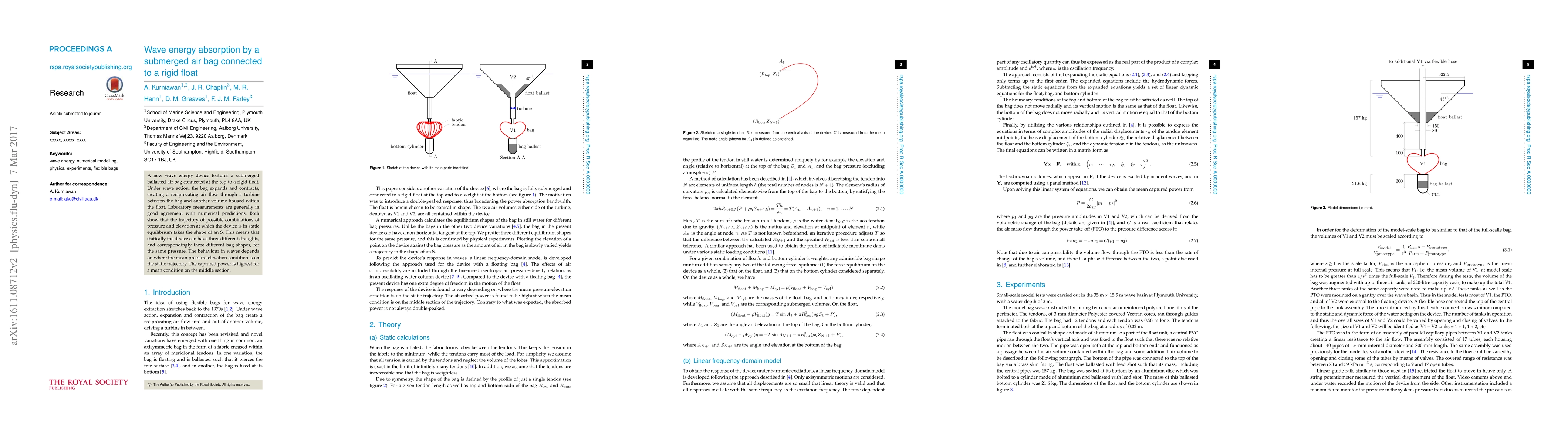 A new wave energy device features a submerged ballasted air bag connected at the top to a rigid float. Under wave action, the bag expands and contracts, creating a reciprocating air flow through a turbine between the bag and another volume housed within the float. Laboratory measurements are generally in good agreement with numerical predictions. Both show that the trajectory of possible combinations of pressure and elevation at which the device is in static equilibrium takes the shape of an S. This means that statically the device can have three different draughts, and correspondingly three different bag shapes, for the same pressure. The behaviour in waves depends on where the mean pressure-elevation condition is on the static trajectory. The captured power is highest for a mean condition on the middle section.