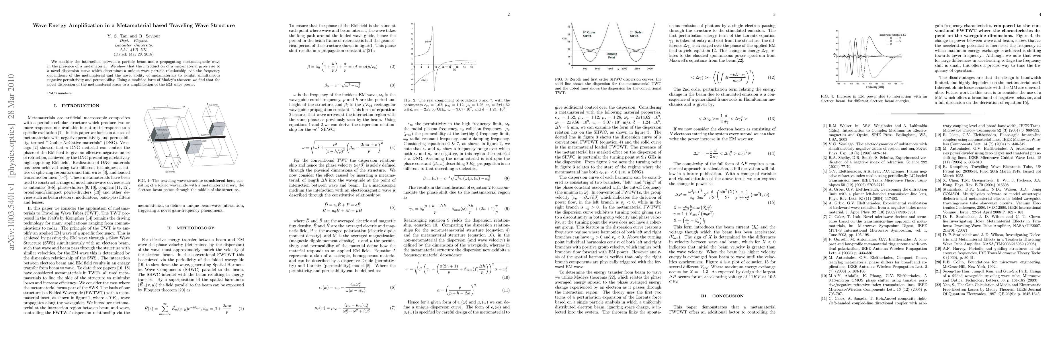 We consider the interaction between a particle beam and a propagating electromagnetic wave in the presence of a metamaterial. We show that the introduction of a metamaterial gives rise to a novel dispersion curve which determines a unique wave particle relationship, via the frequency dependence of the metamaterial and the novel ability of metamaterials to exhibit simultaneous negative permittivity and permeability. Using a modified form of Madey's theorem we find that the novel dispersion of the metamaterial leads to a amplification of the EM wave power.