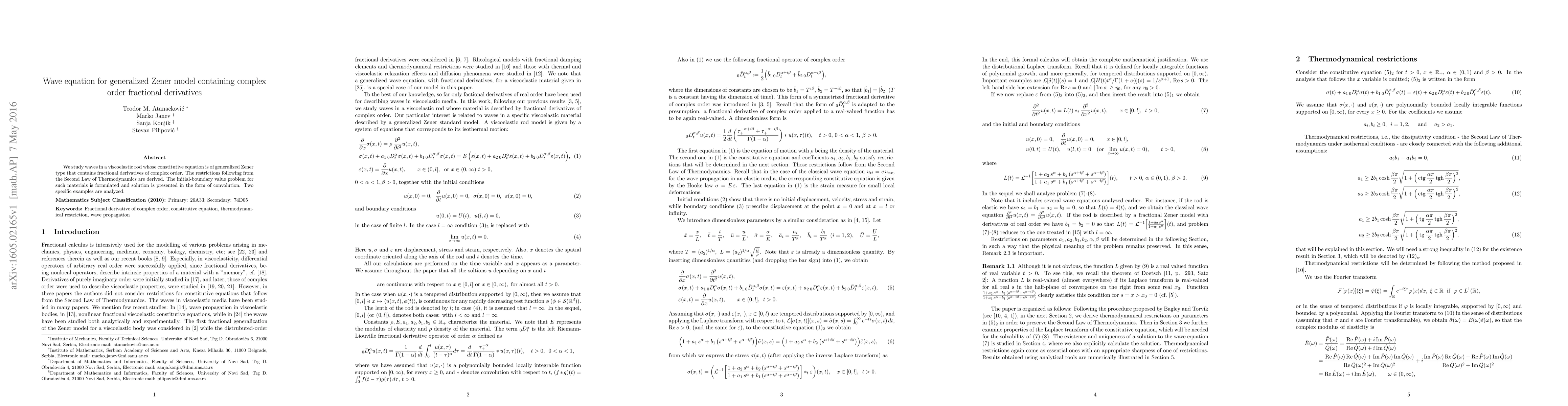 This paper investigates wave propagation in a viscoelastic rod modeled by a generalized Zener constitutive equation with complex order fractional derivatives. It derives thermodynamic restrictions and presents a solution for the initial-boundary value problem in convolution form, analyzing two specific examples.