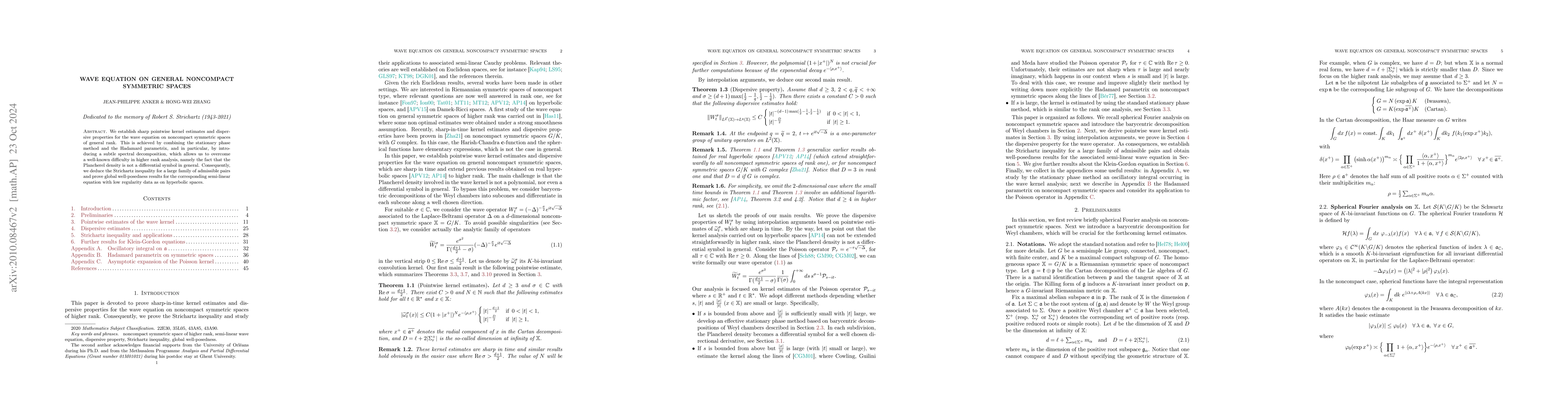 The novelty lies in the subtle spectral decomposition technique used to handle the Plancherel density issue in higher rank analysis, enabling sharper kernel estimates and dispersive properties for the wave equation on general noncompact symmetric spaces.