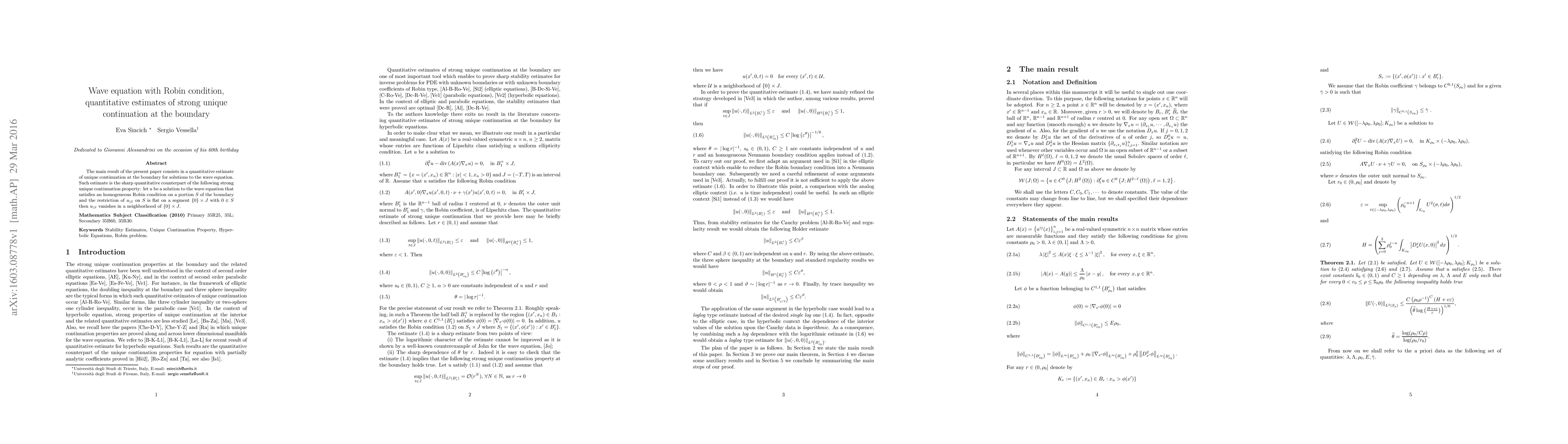The main result of the present paper consists in a quantitative estimate of unique continuation at the boundary for solutions to the wave equation. Such estimate is the sharp quantitative counterpart of the following strong unique continuation property: let $u$ be a solution to the wave equation that satisfies an homogeneous Robin condition on a portion $S$ of the boundary and the restriction of $u_{\mid S}$ on $S$ is flat on a segment $\{0\}\times J$ with $0\in S$ then $u_{\mid S}$ vanishes in a neighborhood of $\{0\}\times J$.
