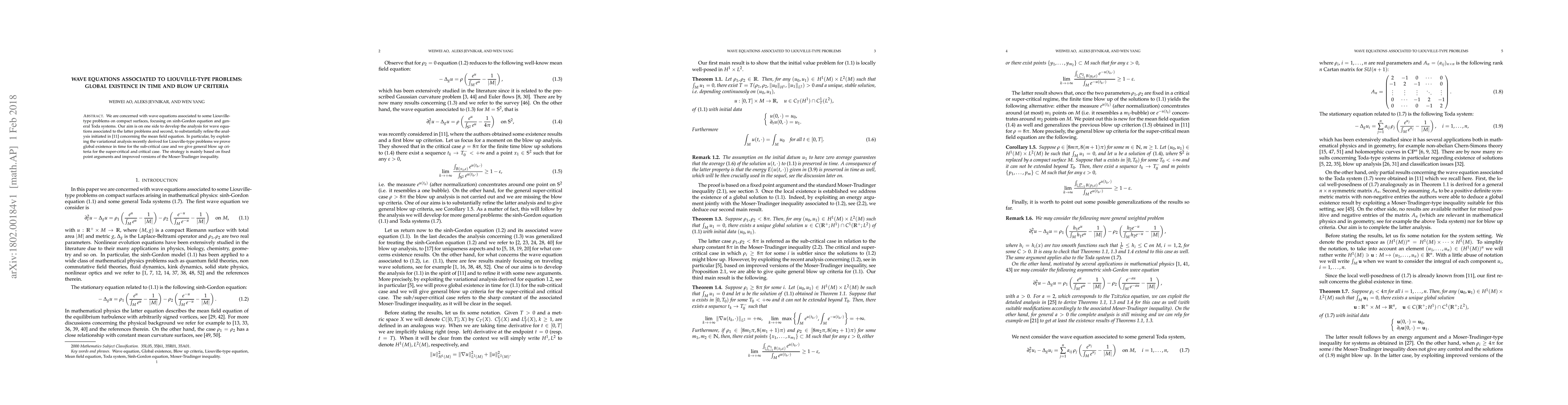 We are concerned with wave equations associated to some Liouville-type problems on compact surfaces, focusing on sinh-Gordon equation and general Toda systems. Our aim is on one side to develop the analysis for wave equations associated to the latter problems and second, to substantially refine the analysis initiated in [11] concerning the mean field equation. In particular, by exploiting the variational analysis recently derived for Liouville-type problems we prove global existence in time for the sub-critical case and we give general blow up criteria for the super-critical and critical case. The strategy is mainly based on fixed point arguments and improved versions of the Moser-Trudinger inequality.