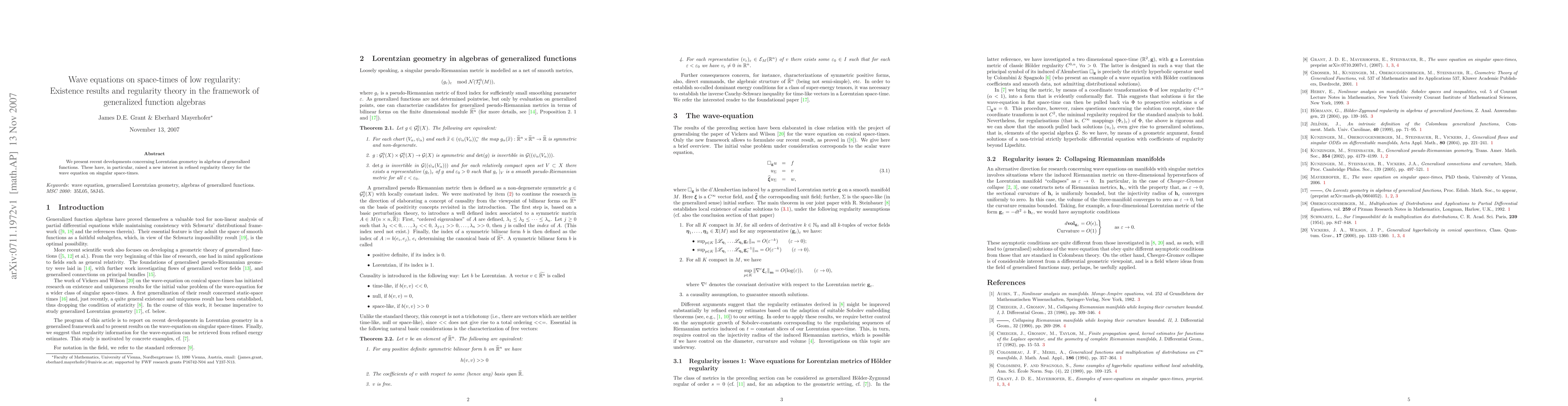 Summary: This paper explores recent advancements in Lorentzian geometry using generalized function algebras, focusing on the existence and refined regularity of wave equations on singular space-times. The study highlights new insights into the mathematical framework for handling low regularity in wave equations.
