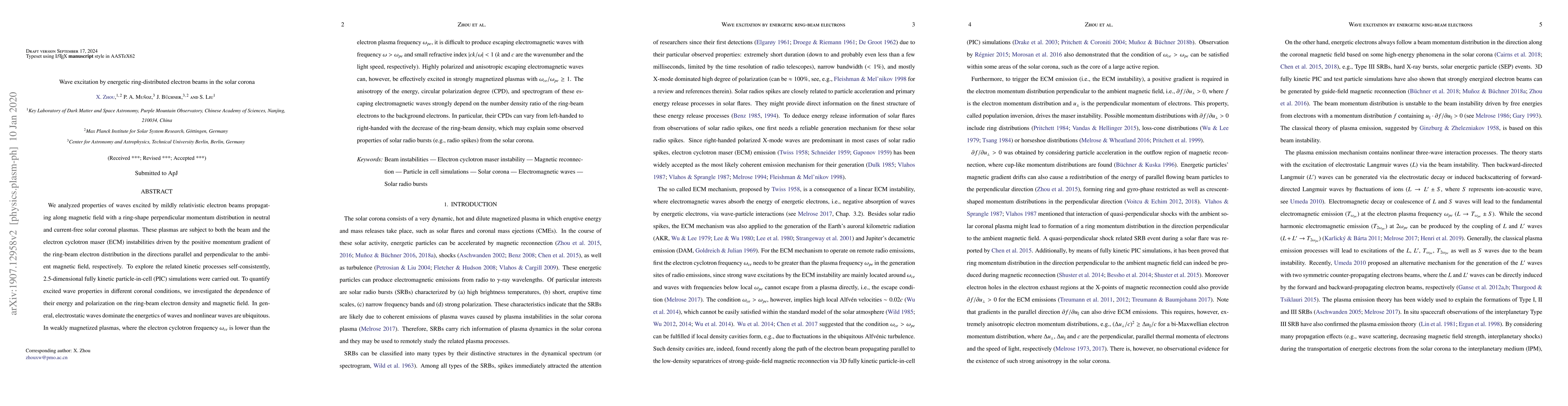 We analyzed properties of waves excited by mildly relativistic electron beams propagating along magnetic field with a ring-shape perpendicular momentum distribution in neutral and current-free solar coronal plasmas. These plasmas are subject to both the beam and the electron cyclotron maser (ECM) instabilities driven by the positive momentum gradient of the ring-beam electron distribution in the directions parallel and perpendicular to the ambient magnetic field, respectively. To explore the related kinetic processes self-consistently, 2.5-dimensional fully kinetic particle-in-cell (PIC) simulations were carried out. To quantify excited wave properties in different coronal conditions, we investigated the dependence of their energy and polarization on the ring-beam electron density and magnetic field. In general, electrostatic waves dominate the energetics of waves and nonlinear waves are ubiquitous. In weakly magnetized plasmas, where the electron cyclotron frequency $\omega_{ce}$ is lower than the electron plasma frequency $\omega_{pe}$, it is difficult to produce escaping electromagnetic waves with frequency $\omega > \omega_{pe}$ and small refractive index $|c k / \omega| < 1$ ($k$ and $c$ are the wavenumber and the light speed, respectively). Highly polarized and anisotropic escaping electromagnetic waves can, however, be effectively excited in strongly magnetized plasmas with $\omega_{ce}/\omega_{pe} \geq 1$. The anisotropy of the energy, circular polarization degree (CPD), and spectrogram of these escaping electromagnetic waves strongly depend on the number density ratio of the ring-beam electrons to the background electrons. In particular, their CPDs can vary from left-handed to right-handed with the decrease of the ring-beam density, which may explain some observed properties of solar radio bursts (e.g., radio spikes) from the solar corona.