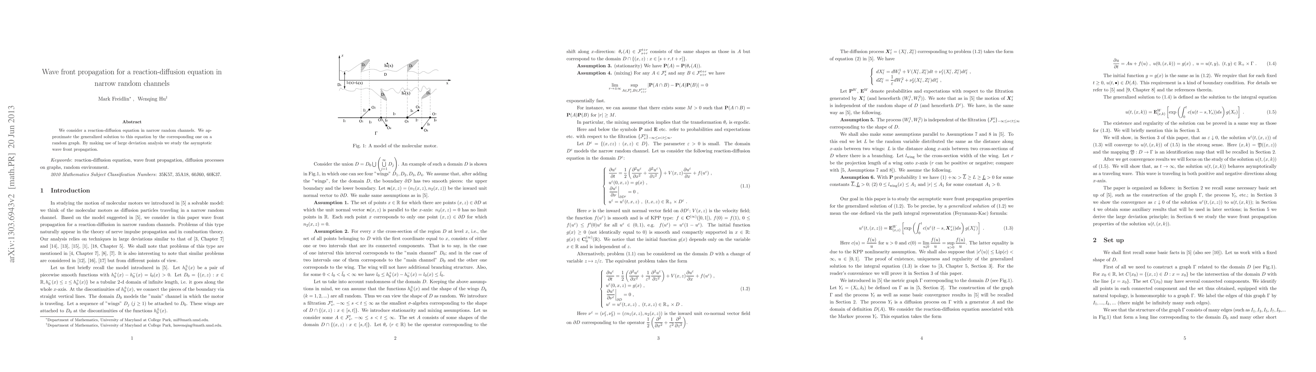 This paper investigates the wave front propagation for a reaction-diffusion equation within narrow random channels, approximating the solution using a random graph model and employing large deviation analysis to study the asymptotic behavior of the wave front.