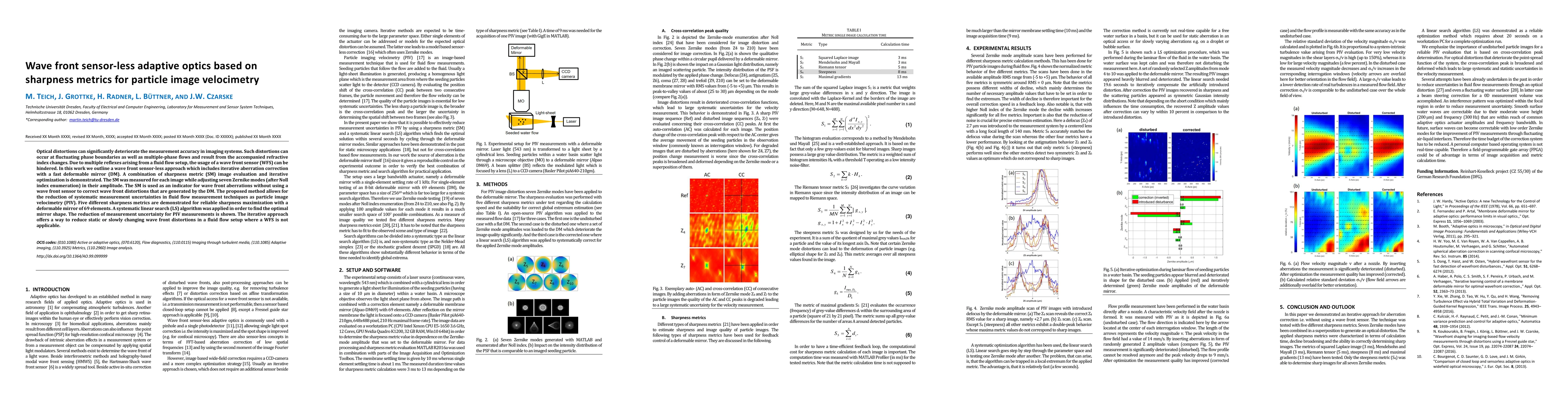 Optical distortions can significantly deteriorate the measurement accuracy in imaging systems. Such distortions can occur at fluctuating phase boundaries as well as multiple-phase flows and result from the accompanied refractive index changes. Due to multiple reflexes arising from a fluid flow setup, the usage of a wave front sensor (WFS) can be hindered. In this work we outline a wave front sensor-less approach which includes iterative aberration correction with a fast deformable mirror (DM). A combination of sharpness metric (SM) image evaluation and iterative optimization is demonstrated. The SM was measured for each image while adjusting seven Zernike modes (after Noll index enumeration) in their amplitude. The SM is used as an indicator for wave front aberrations without using a wave front sensor to correct wave front distortions that are generated by the DM. The proposed method allows for the reduction of systematic measurement uncertainties in fluid flow measurement techniques as particle image velocimetry (PIV). Five different sharpness metrics are demonstrated for reliable sharpness maximization with a deformable mirror of 69 elements. A systematic linear search (LS) algorithm was applied in order to find the optimal mirror shape. The reduction of measurement uncertainty for PIV measurements is shown. The iterative approach offers a way to reduce static or slowly changing wave front distortions in a fluid flow setup where a WFS is not applicable.