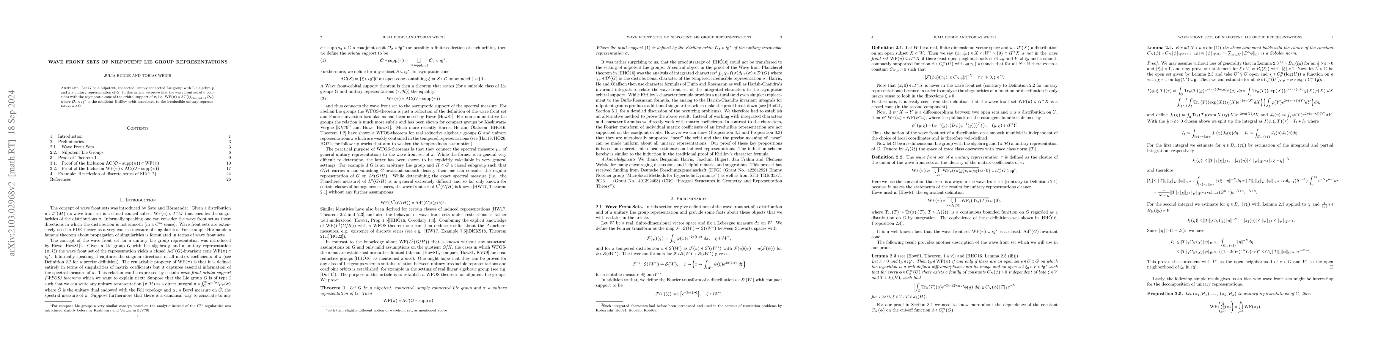 Let $G$ be a nilpotent, connected, simply connected Lie group with Lie algebra $\mathfrak g$, and $\pi$ a unitary representation of $G$. The goal is to prove that the wave front set of $\pi$ coincides with the asymptotic cone of the orbital support of $\pi$, i.e. $\mathrm{WF}(\pi)=\mathrm{AC}(\bigcup_{\sigma\in \mathrm{supp}(\pi)}\mathcal O_\sigma)$, where $\mathcal O_\sigma\subset i\mathfrak g^\ast$ is the coadjoint orbit associated to the irreducible unitary representation $\sigma\in \hat{G}$ by Kirillov.