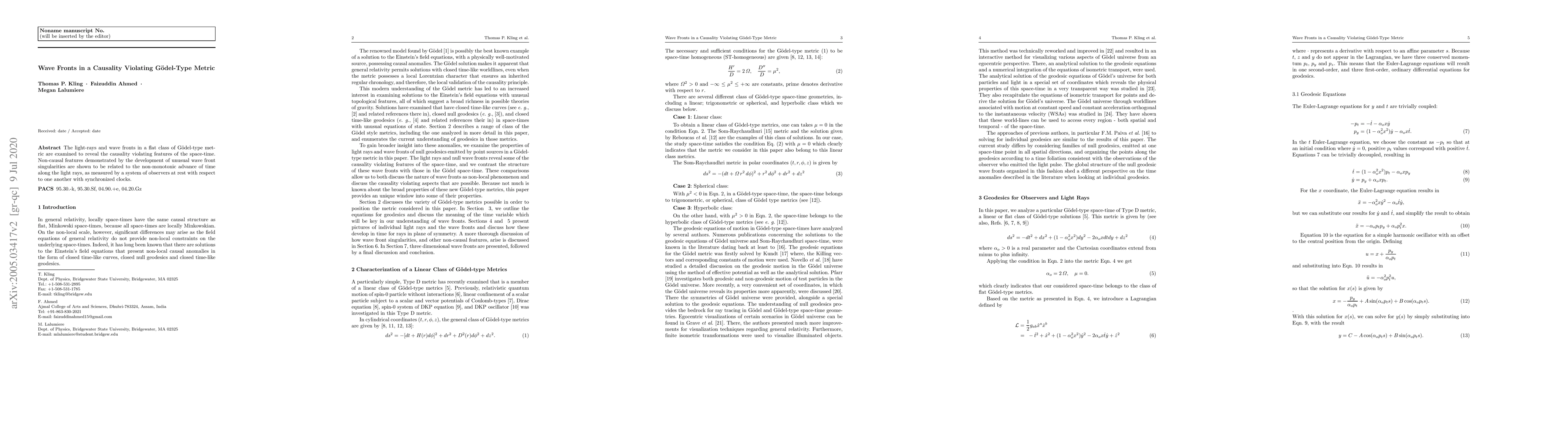 The light-rays and wave fronts in a flat class of Godel-type metric are examined to reveal the causality violating features of the space-time. Non-causal features demonstrated by the development of unusual wave front singularities are shown to be related to the non-monotonic advance of time along the light rays, as measured by a system of observers at rest with respect to one another with synchronized clocks.