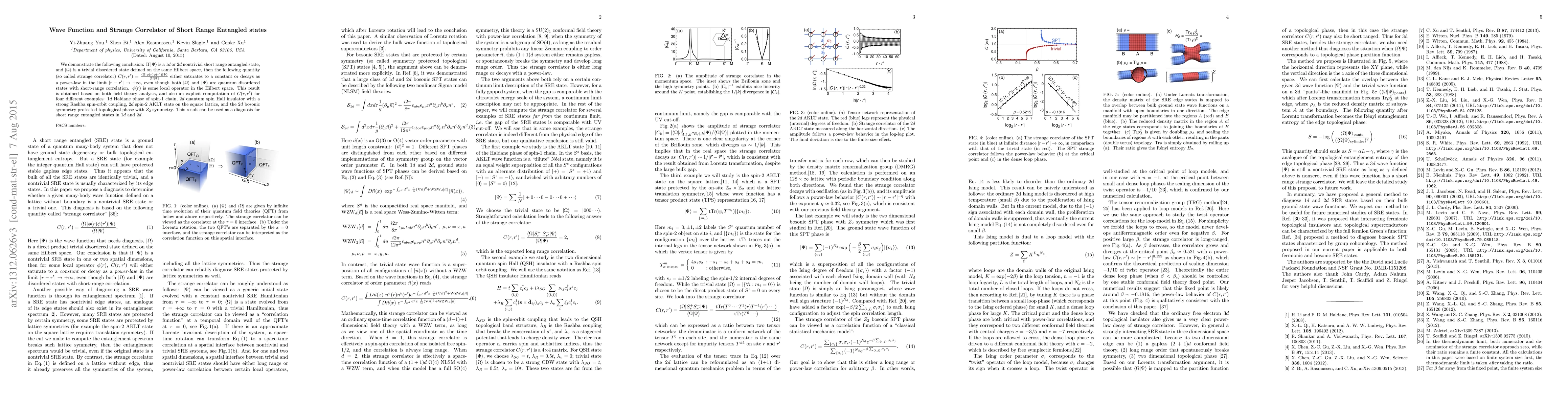 We demonstrate the following conclusion: If $|\Psi\rangle$ is a $1d$ or $2d$ nontrivial short range entangled state, and $|\Omega \rangle$ is a trivial disordered state defined on the same Hilbert space, then the following quantity (so called strange correlator) $C(r, r^\prime) = \frac{\langle \Omega|\phi(r) \phi(r^\prime) | \Psi\rangle}{\langle \Omega| \Psi\rangle}$ either saturates to a constant or decays as a power-law in the limit $|r - r^\prime| \rightarrow +\infty$, even though both $| \Omega\rangle$ and $| \Psi\rangle$ are quantum disordered states with short-range correlation. $\phi(r)$ is some local operator in the Hilbert space. This result is obtained based on both field theory analysis, and also an explicit computation of $C(r, r^\prime)$ for four different examples: $1d$ Haldane phase of spin-1 chain, $2d$ quantum spin Hall insulator with a strong Rashba spin-orbit coupling, $2d$ spin-2 AKLT state on the square lattice, and the $2d$ bosonic symmetry protected topological phase with $Z_2$ symmetry. This result can be used as a diagnosis for short range entangled states in $1d$ and $2d$. A possible diagnosis for $3d$ short range entangled states is also proposed.