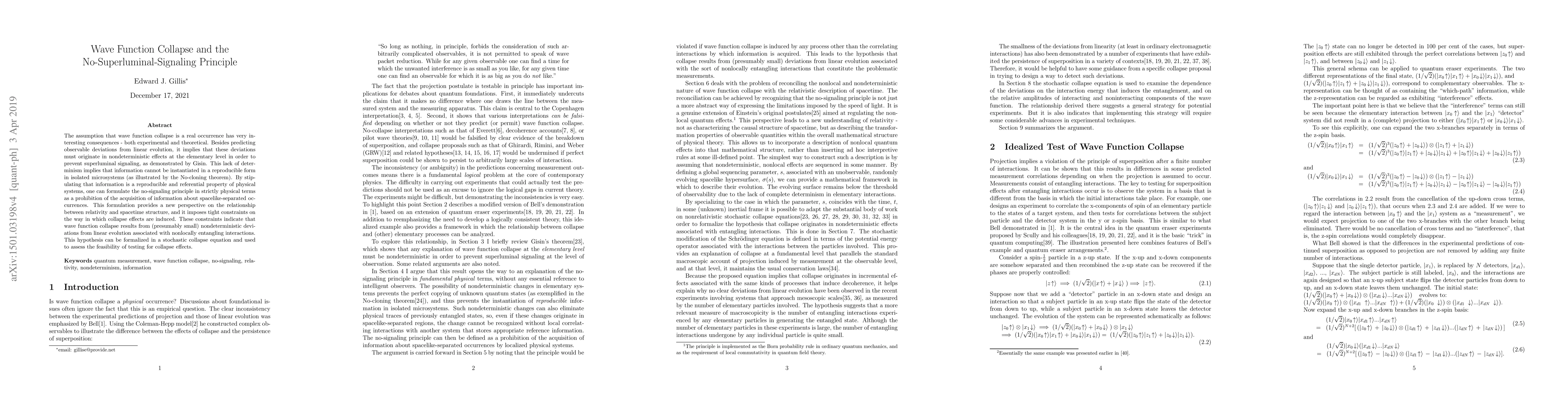 The assumption that wave function collapse is a real occurrence has very interesting consequences - both experimental and theoretical. Besides predicting observable deviations from linear evolution, it implies that these deviations must originate in nondeterministic effects at the elementary level in order to prevent superluminal signaling, as demonstrated by Gisin. This lack of determinism implies that information cannot be instantiated in a reproducible form in isolated microsystems (as illustrated by the No-cloning theorem). By stipulating that information is a reproducible and referential property of physical systems, one can formulate the no-signaling principle in strictly physical terms as a prohibition of the acquisition of information about spacelike-separated occurrences. This formulation provides a new perspective on the relationship between relativity and spacetime structure, and it imposes tight constraints on the way in which collapse effects are induced. These constraints indicate that wave function collapse results from (presumably small) nondeterministic deviations from linear evolution associated with nonlocally entangling interactions. This hypothesis can be formalized in a stochastic collapse equation and used to assess the feasibility of testing for collapse effects.
