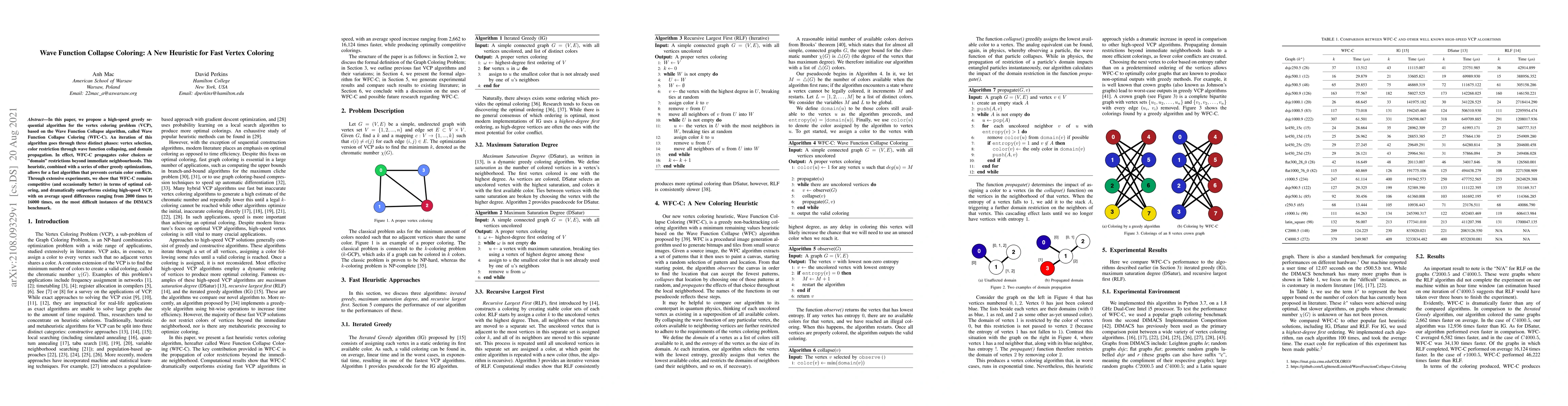This paper introduces Wave Function Collapse Coloring (WFC-C), a fast heuristic algorithm for the vertex coloring problem based on the Wave Function Collapse method. The algorithm iteratively selects vertices, restricts colors via wave function collapsing, and propagates domain restrictions, significantly outperforming existing high-speed methods by up to 16,000 times faster on difficult instances.