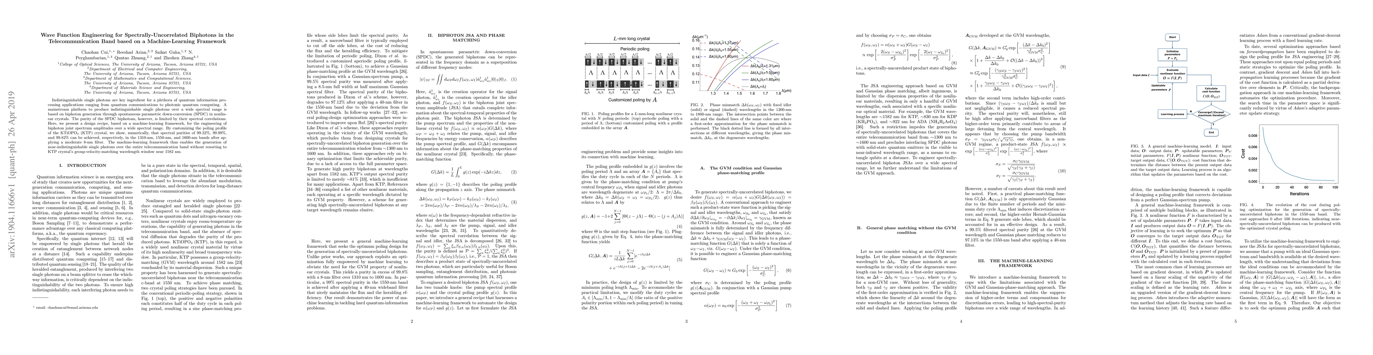 This paper presents a machine-learning framework for engineering biphoton joint spectrum amplitudes to produce spectrally-uncorrelated single photons in the telecommunication band. By customizing the KTiOPO$_4$ (KTP) crystal's poling profile, the authors achieve high spectral purities of 99.22%, 99.99%, and 99.82% in the 1310-nm, 1550-nm, and 1600-nm bands, respectively.