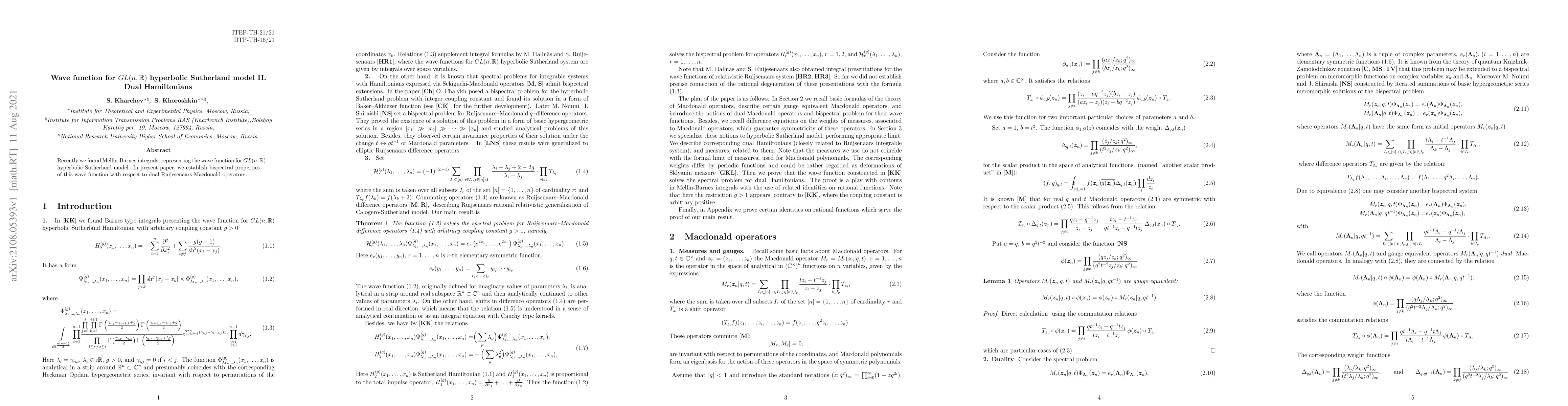 Recently we found Mellin-Barnes integrals, representing the wave function for $GL(n,\mathbb{R})$ hyperbolic Sutherland model. In present paper, we establish bispectral properties of this wave function with respect to dual Ruijesenaars-Macdonald operators.