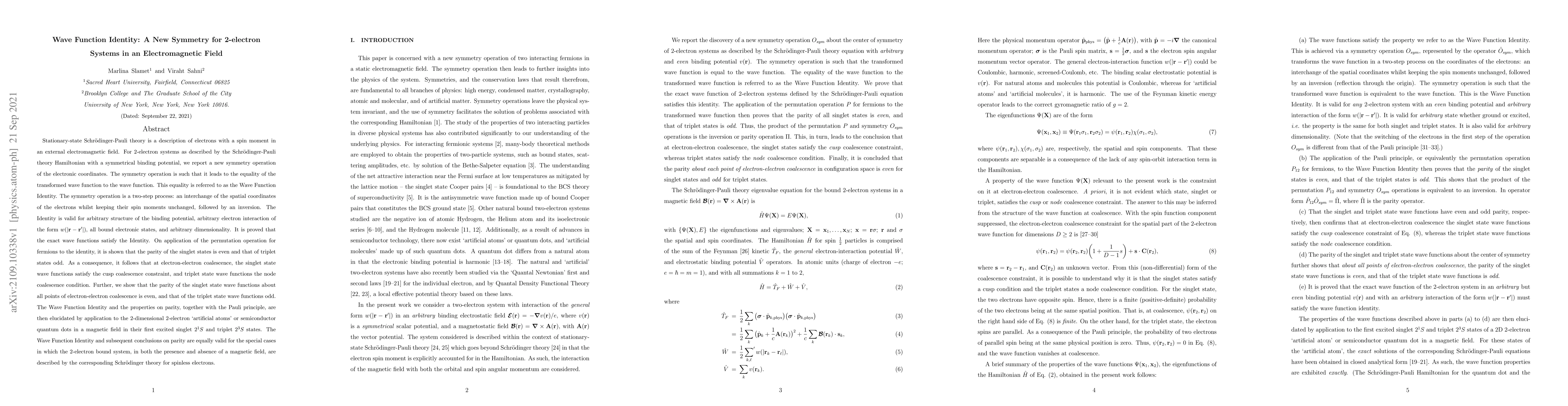 Researchers discover a new symmetry in 2-electron systems with an electromagnetic field, leading to a unique property called the Wave Function Identity that affects how electrons behave at coalescence points.