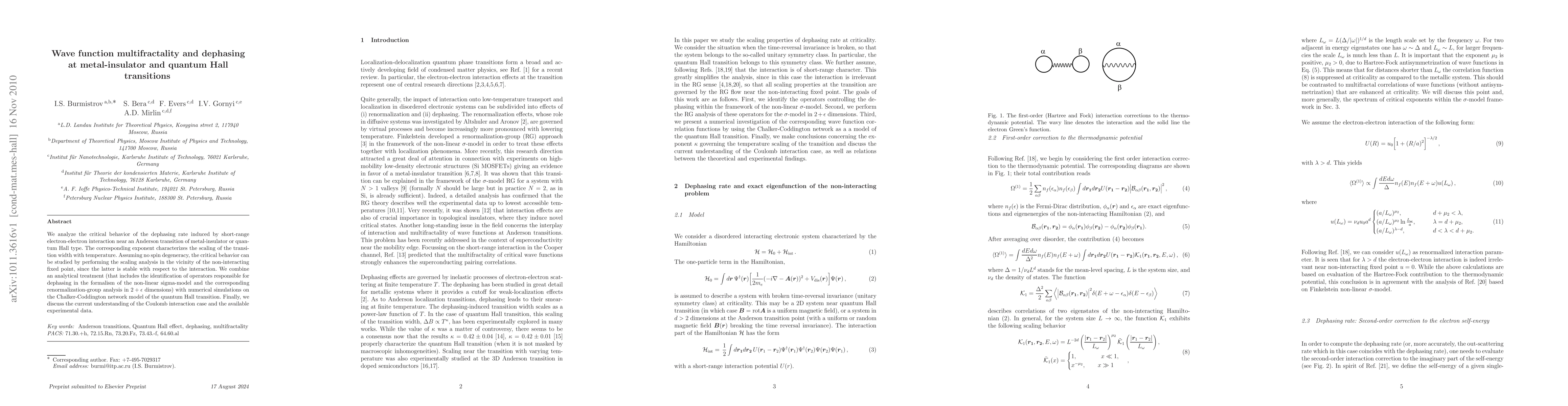 This paper investigates the critical behavior of the dephasing rate due to electron-electron interactions near metal-insulator and quantum Hall transitions, employing analytical and numerical methods to study the scaling of transition width with temperature. The study combines renormalization-group analysis and simulations on the Chalker-Coddington model to understand the role of short-range interactions.