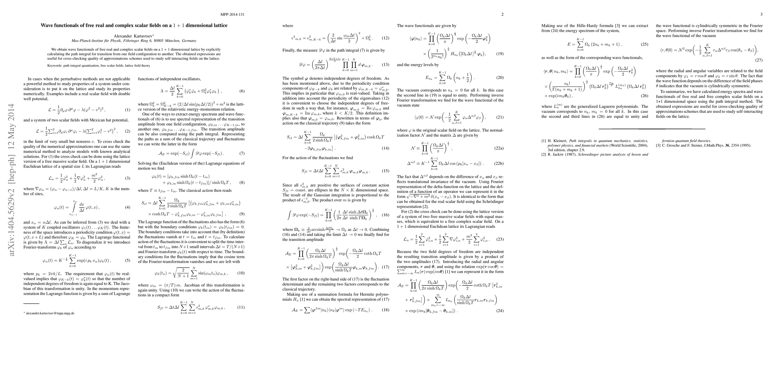 We obtain wave functionals of free real and complex scalar fields on a 1+1 dimensional lattice by explicitly calculating the path integral for transition from one field configuration to another. The obtained expressions are useful for cross-checking quality of approximations schemes used to study self-interacting fields on the lattice.