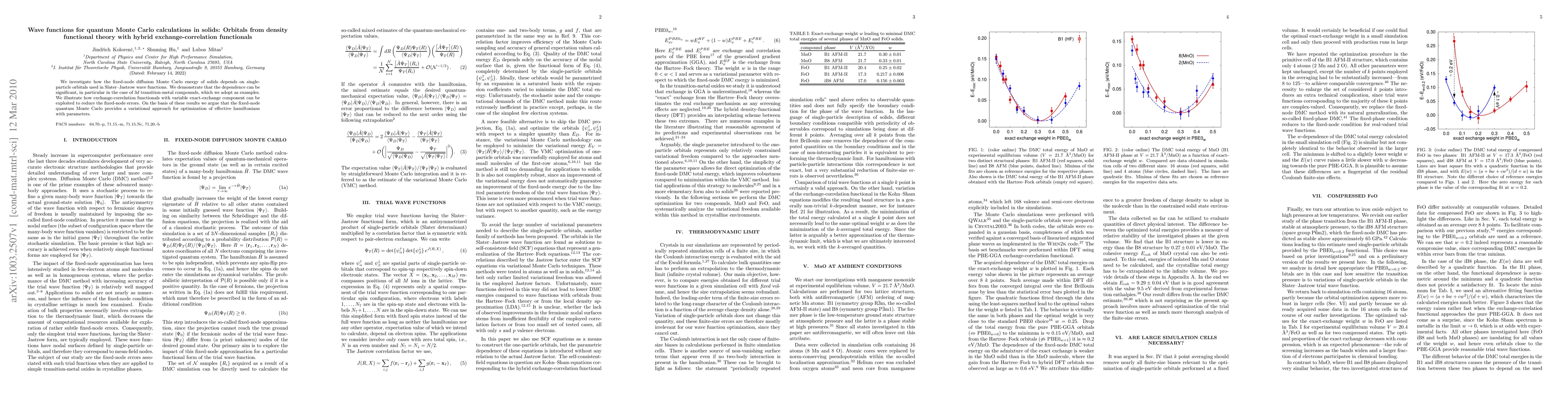 We investigate how the fixed-node diffusion Monte Carlo energy of solids depends on single-particle orbitals used in Slater--Jastrow wave functions. We demonstrate that the dependence can be significant, in particular in the case of 3d transition-metal compounds, which we adopt as examples. We illustrate how exchange-correlation functionals with variable exact-exchange component can be exploited to reduce the fixed-node errors. On the basis of these results we argue that the fixed-node quantum Monte Carlo provides a variational approach for optimization of effective hamiltonians with parameters.