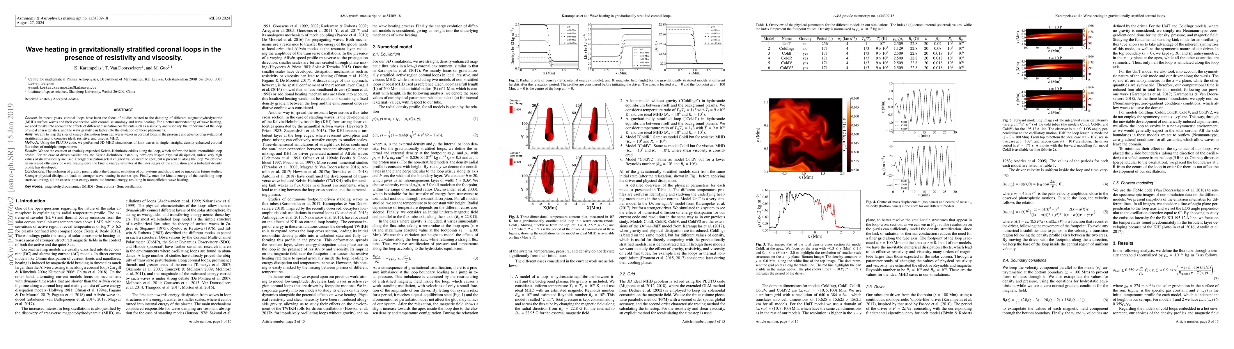 In recent years, coronal loops have been the focus of studies related to the damping of different magnetohydrodynamic (MHD) surface waves and their connection with coronal seismology and wave heating. For a better understanding of wave heating, we need to take into account the effects of different dissipation coefficients such as resistivity and viscosity, the importance of the loop physical characteristics, and the ways gravity can factor into the evolution of these phenomena. We aim to map the sites of energy dissipation from transverse waves in coronal loops in the presence and absence of gravitational stratification and to compare ideal, resistive, and viscous MHD. Using the PLUTO code, we performed 3D MHD simulations of kink waves in single, straight, density-enhanced coronal flux tubes of multiple temperatures. We see the creation of spatially expanded Kelvin-Helmholtz eddies along the loop, which deform the initial monolithic loop profile. For the case of driven oscillations, the Kelvin-Helmholtz instability develops despite physical dissipation, unless very high values of shear viscosity are used. Energy dissipation gets its highest values near the apex, but is present all along the loop. We observe an increased efficiency of wave heating once the kinetic energy saturates at the later stages of the simulation and a turbulent density profile has developed. The inclusion of gravity greatly alters the dynamic evolution of our systems and should not be ignored in future studies. Stronger physical dissipation leads to stronger wave heating in our set-ups. Finally, once the kinetic energy of the oscillating loop starts saturating, all the excess input energy turns into internal energy, resulting in more efficient wave heating.