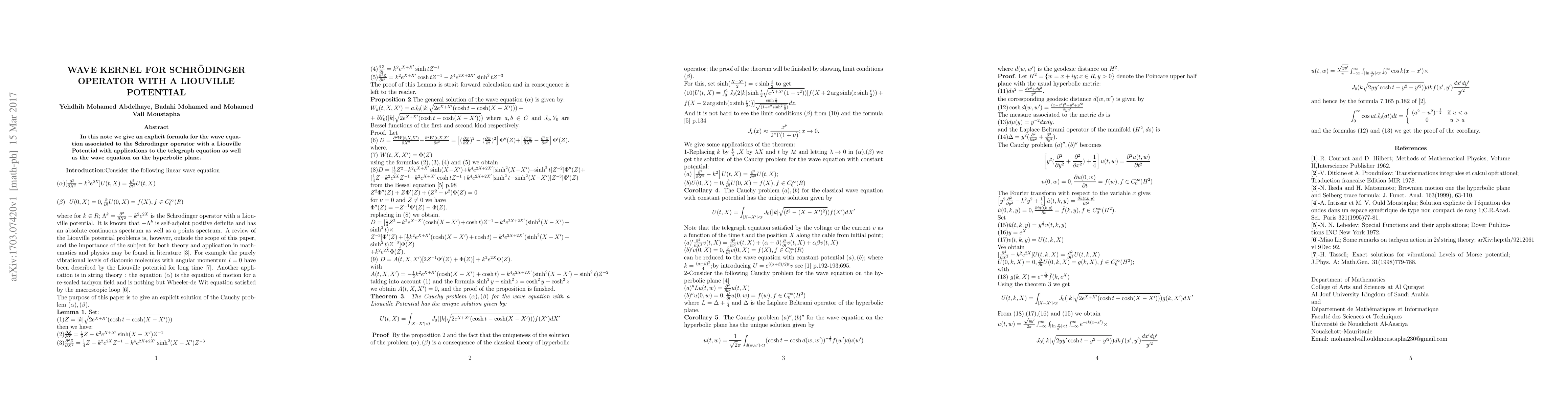 This paper provides an explicit formula for the wave kernel of the Schrödinger operator with a Liouville potential, with implications for both the telegraph equation and the wave equation on the hyperbolic plane. The results contribute to the understanding of wave propagation in complex potential fields.