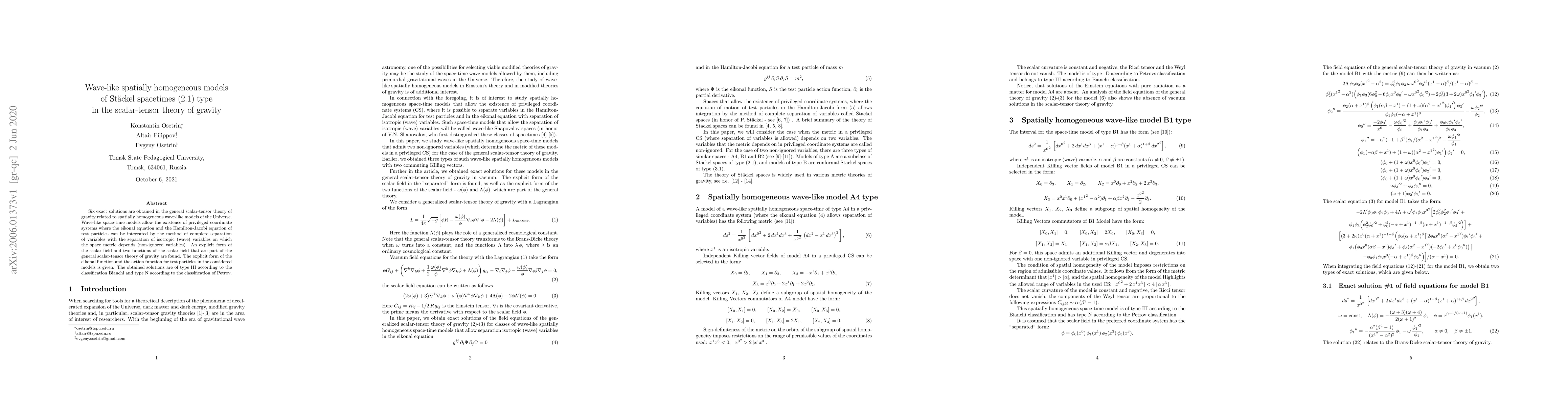 Six exact solutions are obtained in the general scalar-tensor theory of gravity related to spatially homogeneous wave-like models of the Universe. Wave-like space-time models allow the existence of privileged coordinate systems where the eikonal equation and the Hamilton-Jacobi equation of test particles can be integrated by the method of complete separation of variables with the separation of isotropic (wave) variables on which the space metric depends (non-ignored variables). An explicit form of the scalar field and two functions of the scalar field that are part of the general scalar-tensor theory of gravity are found. The explicit form of the eikonal function and the action function for test particles in the considered models is given. The obtained solutions are of type III according to the classification Bianchi and type N according to the classification of Petrov.