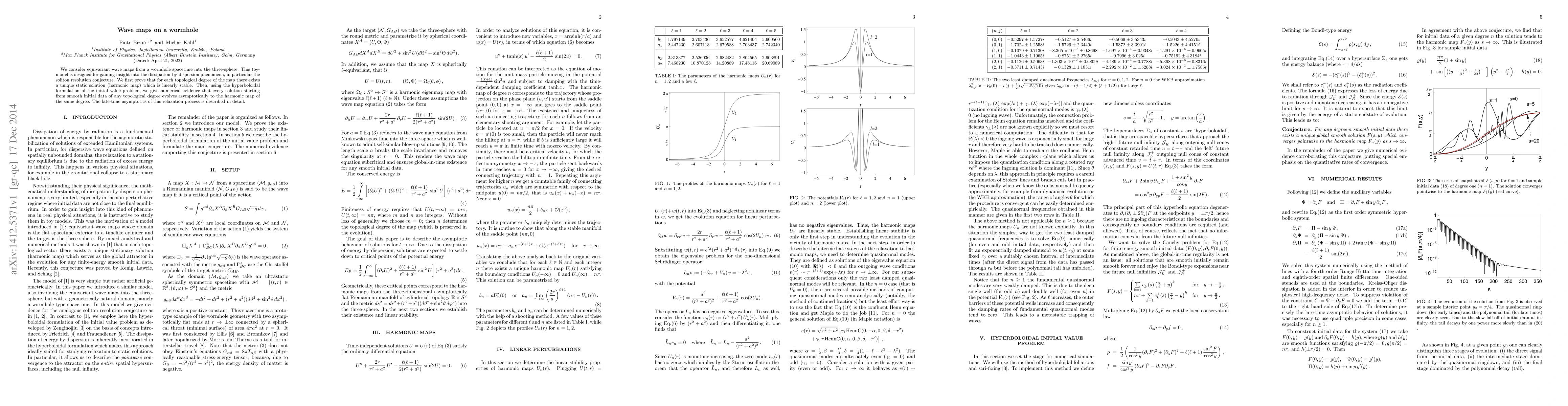 We consider equivariant wave maps from a wormhole spacetime into the three-sphere. This toy-model is designed for gaining insight into the dissipation-by-dispersion phenomena, in particular the soliton resolution conjecture. We first prove that for each topological degree of the map there exists a unique static solution (harmonic map) which is linearly stable. Then, using the hyperboloidal formulation of the initial value problem, we give numerical evidence that every solution starting from smooth initial data of any topological degree evolves asymptotically to the harmonic map of the same degree. The late-time asymptotics of this relaxation process is described in detail.