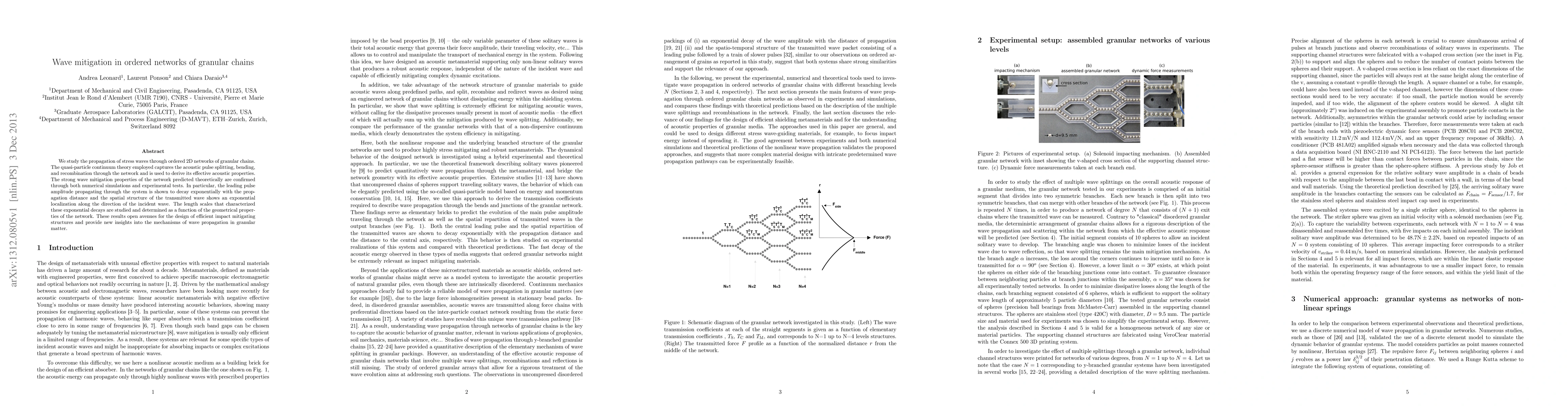 This paper investigates stress wave propagation in ordered 2D granular chain networks using quasi-particle continuum theory, revealing strong wave mitigation effects. Experimental and numerical results confirm exponential decay and localization of wave amplitudes, providing insights for designing impact-mitigating structures.
