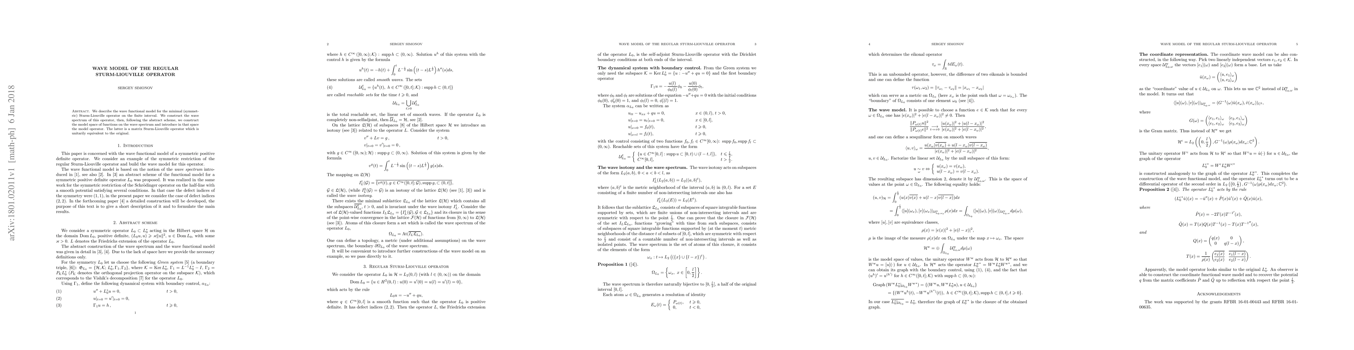 We describe the wave functional model for the minimal (symmetric) Sturm-Liouville operator on the finite interval. We construct the wave spectrum of this operator, then, following the abstract scheme, we construct the model space of functions on the wave spectrum and introduce in that space the model operator. The latter is a matrix Sturm-Liouville operator which is unitarily equivalent to the original.