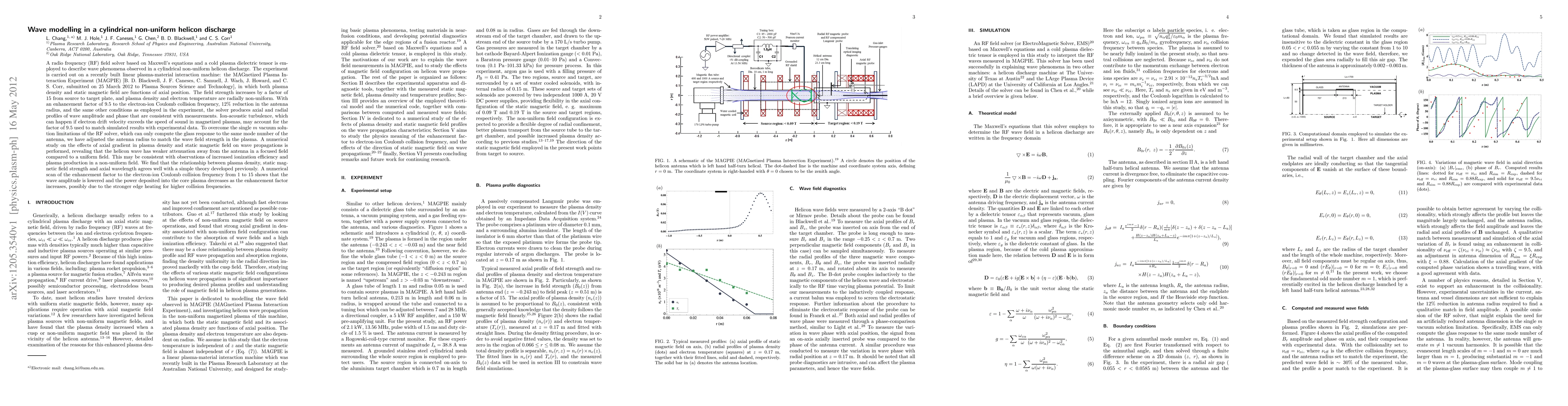A radio frequency (RF) field solver based on Maxwell's equations and a cold plasma dielectric tensor is em- ployed to describe wave phenomena observed in a cylindrical non-uniform helicon discharge. The experiment is carried out on a recently built linear plasma-material interaction machine: the MAGnetized Plasma In- teraction Experiment (MAGPIE) [B. D. Blackwell, J. F. Caneses, C. Samuell, J. Wach, J. Howard, and C. S. Corr, submitted on 25 March 2012 to Plasma Sources Science and Technology], in which both plasma density and static magnetic field are functions of axial position. The field strength increases by a factor of 15 from source to target plate, and plasma density and electron temperature are radially non-uniform. With an enhancement factor of 9.5 to the electron-ion Coulomb collision frequency, 12% reduction in the antenna radius, and the same other conditions as employed in the experiment, the solver produces axial and radial profiles of wave amplitude and phase that are consistent with measurements. Ion-acoustic turbulence, which can happen if electron drift velocity exceeds the speed of sound in magnetized plasmas, may account for the factor of 9.5 used to match simulated results with experimental data. To overcome the single m vacuum solu- tion limitations of the RF solver, which can only compute the glass response to the same mode number of the antenna, we have adjusted the antenna radius to match the wave field strength in the plasma.(not finished because of the limited number of characters, please see the full paper)
