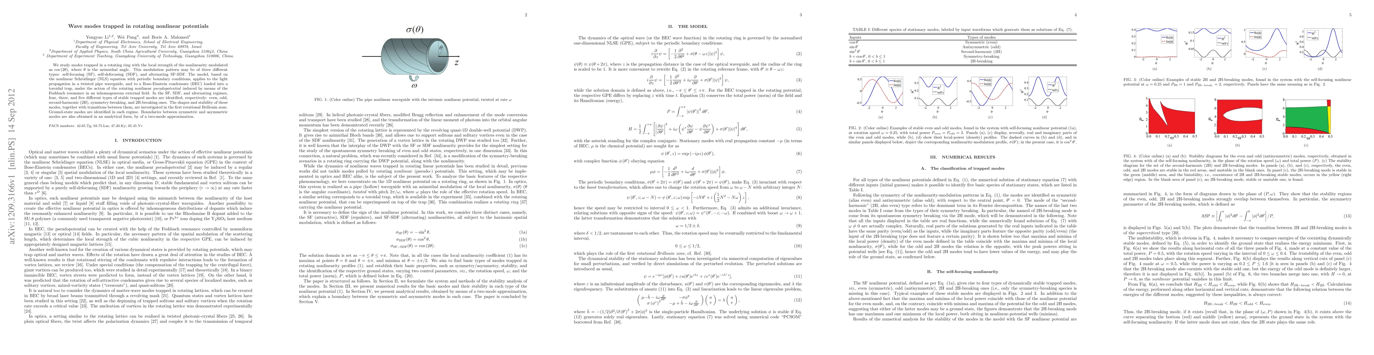 This paper investigates trapped wave modes in a rotating nonlinear potential modulated by a cos(2θ) pattern, identifying stable modes in self-focusing, self-defocusing, and alternating regimes. The study applies to light propagation in twisted waveguides and Bose-Einstein condensates in toroidal traps, revealing distinct stable modes and transitions within the first rotational Brillouin zone.