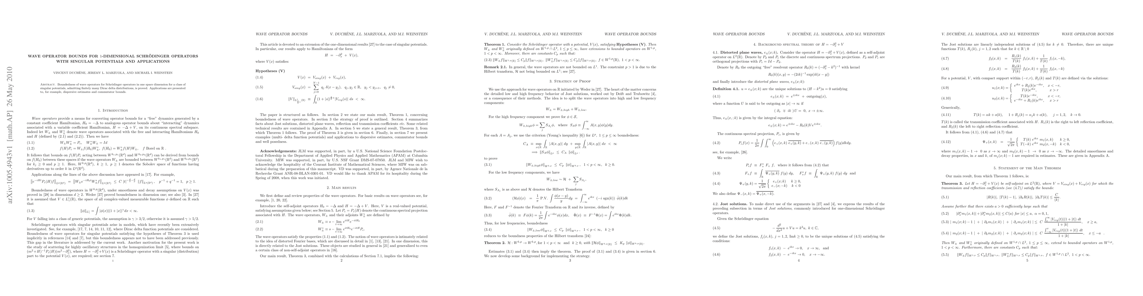 Summary: The paper proves boundedness of wave operators for 1D Schrödinger operators with singular potentials, including finitely many Dirac delta distributions, and applies these results to dispersive estimates and commutator bounds.