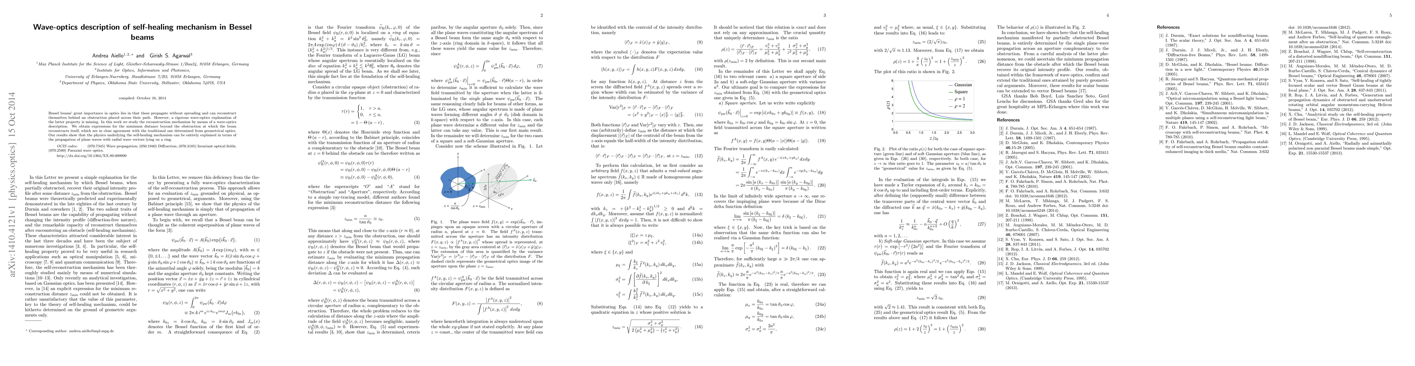 This paper provides a wave-optics explanation for the self-healing mechanism of Bessel beams, showing how they reconstruct after an obstruction. The study derives expressions for the minimum reconstruction distance, demonstrating that the phenomenon can be explained by the propagation of plane waves with radial wave vectors.