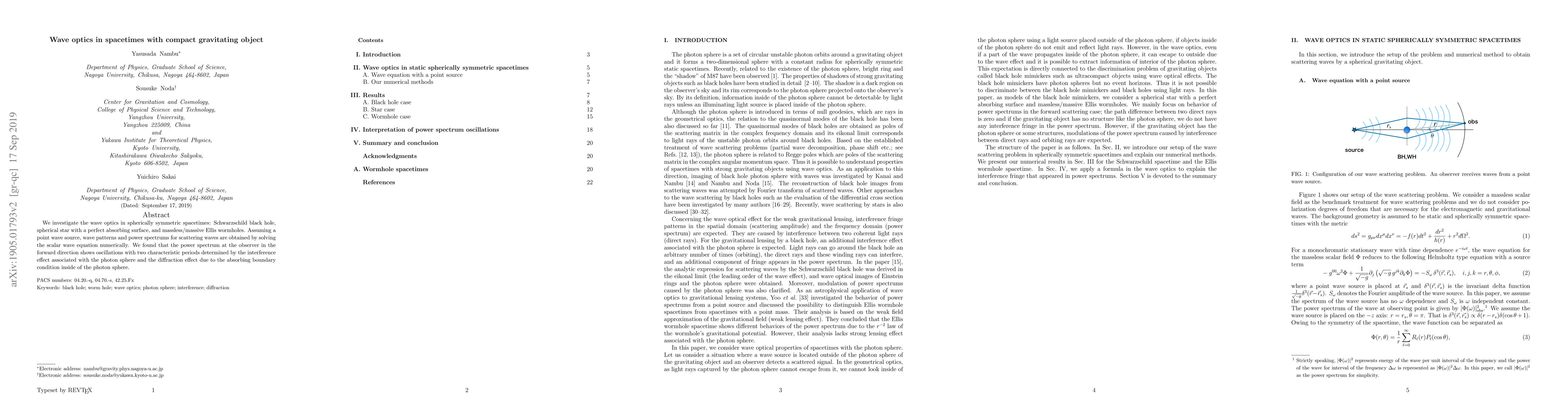 We investigate the wave optics in spherically symmetric spacetimes: Schwarzschild black hole, spherical star with a perfect absorbing surface, and massless/massive Ellis wormholes. Assuming a point wave source, wave pattern and power spectrums for scattering waves are obtained by solving the scalar wave equation numerically. We found that the power spectrum at the observer in the forward direction shows oscillations with two characteristic periods determined by the interference effect associated with the photon sphere and the diffraction effect due to the absorbing boundary condition inside of the photon sphere.