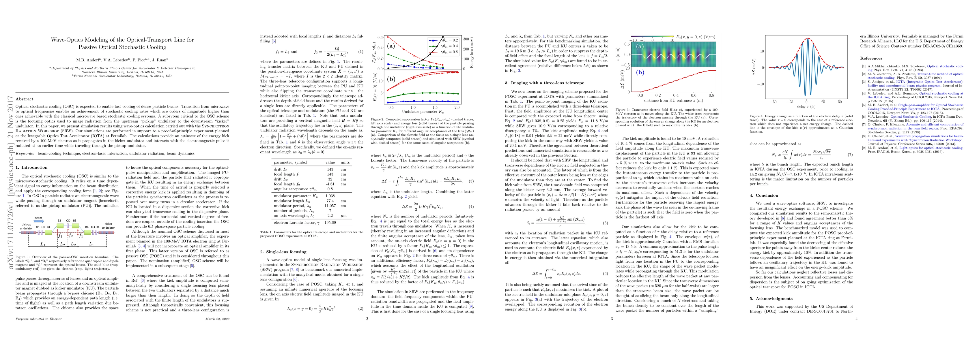 Optical stochastic cooling (OSC) is expected to enable fast cooling of dense particle beams. Transition from microwave to optical frequencies enables an achievement of stochastic cooling rates which are orders of magnitude higher than ones achievable with the classical microwave based stochastic cooling systems. A subsytem critical to the OSC scheme is the focusing optics used to image radiation from the upstream "pickup" undulator to the downstream "kicker" undulator. In this paper, we present simulation results using wave-optics calculation carried out with the {\sc Synchrotron Radiation Workshop} (SRW). Our simulations are performed in support to a proof-of-principle experiment planned at the Integrable Optics Test Accelerator (IOTA) at Fermilab. The calculations provide an estimate of the energy kick received by a 100-MeV electron as it propagates in the kicker undulator and interacts with the electromagnetic pulse it radiated at an earlier time while traveling through the pickup undulator.
